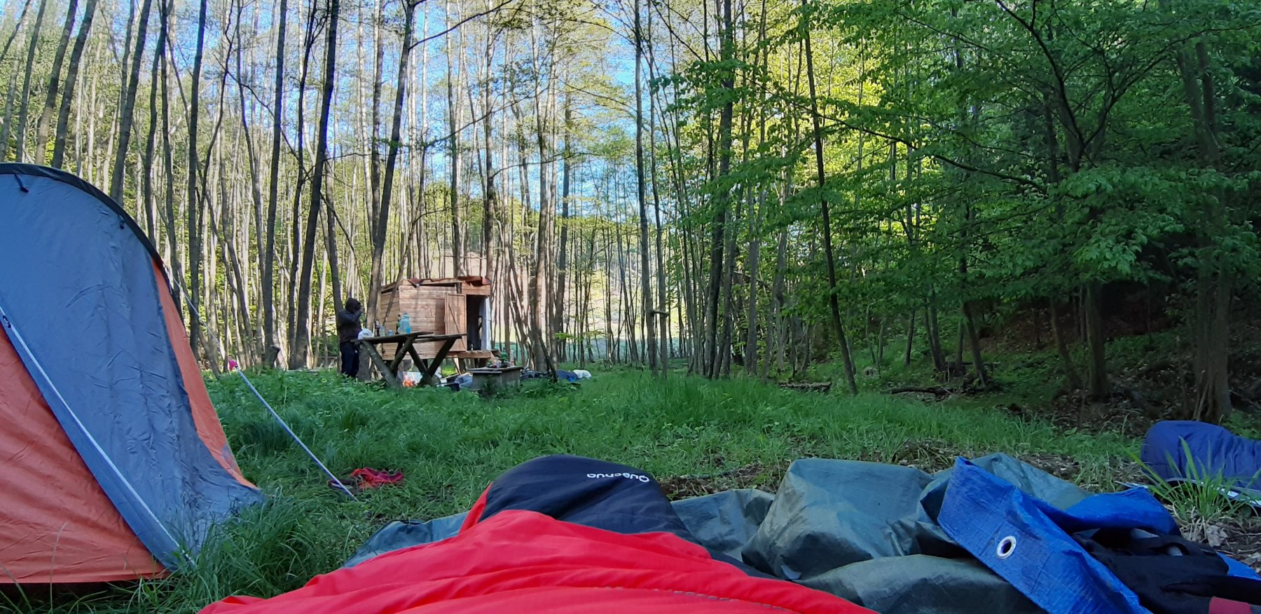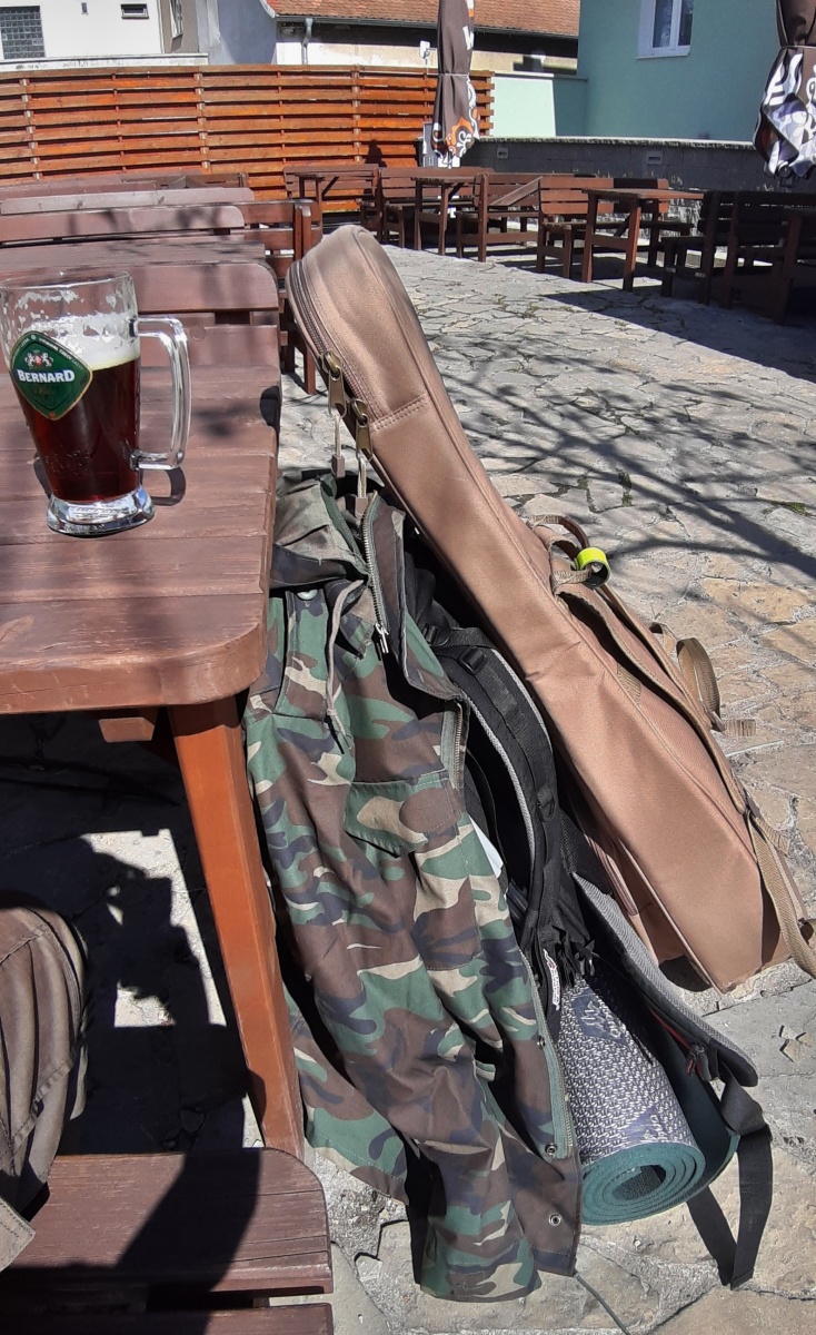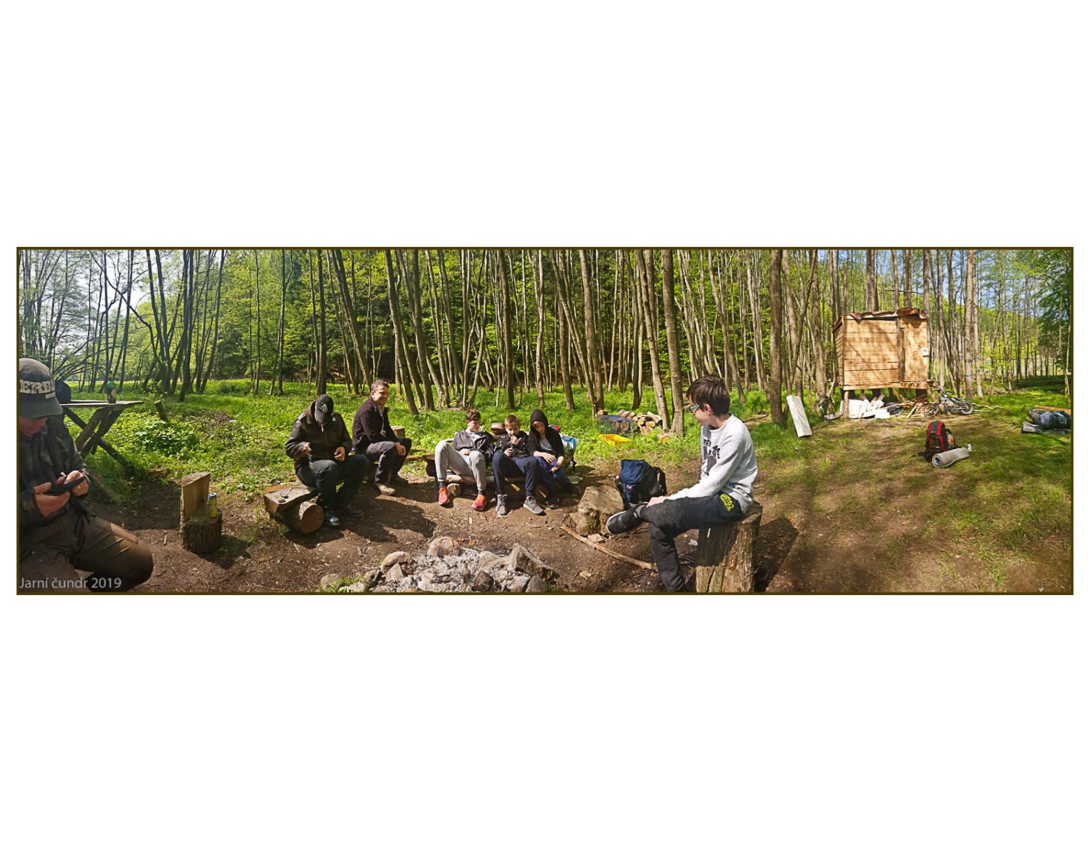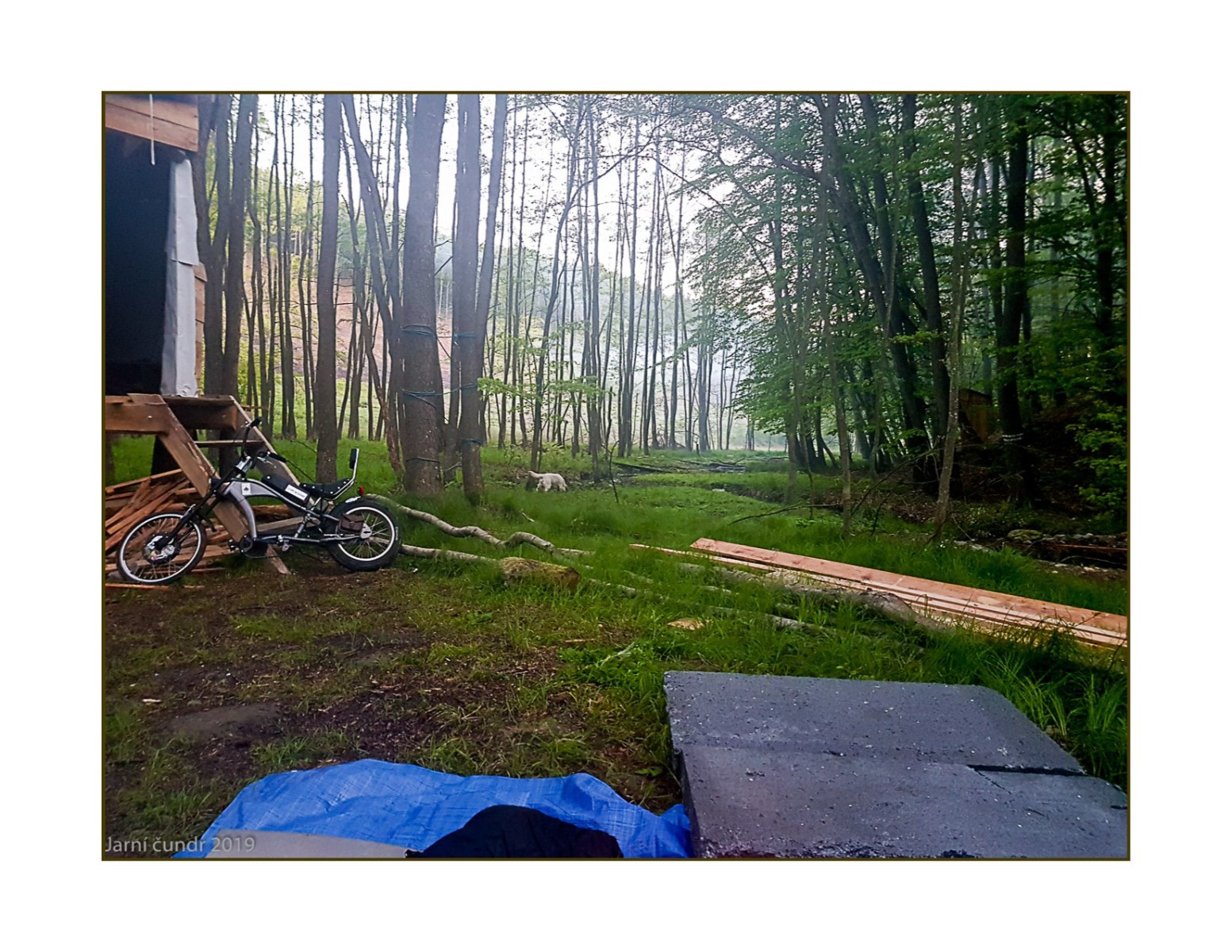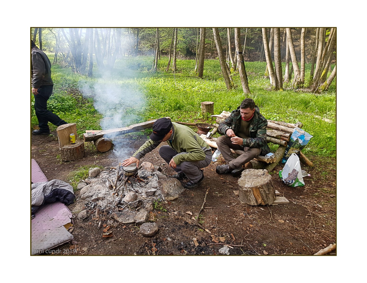 Teplota je tak akorát a ráno se nám probudilo do prvotřídního slunečna. Rozděláváme oheň z uhlíků z předchozí noci a vaříme kafe. Dnešním cílem je oběd a pivko na Bukovince. Není to daleko, takže vlastně není kam spěchat a oheň hoří hezky. Někteří odvážní si zkouší elektrochopper a po chvíli už si jdeme každý po svém.