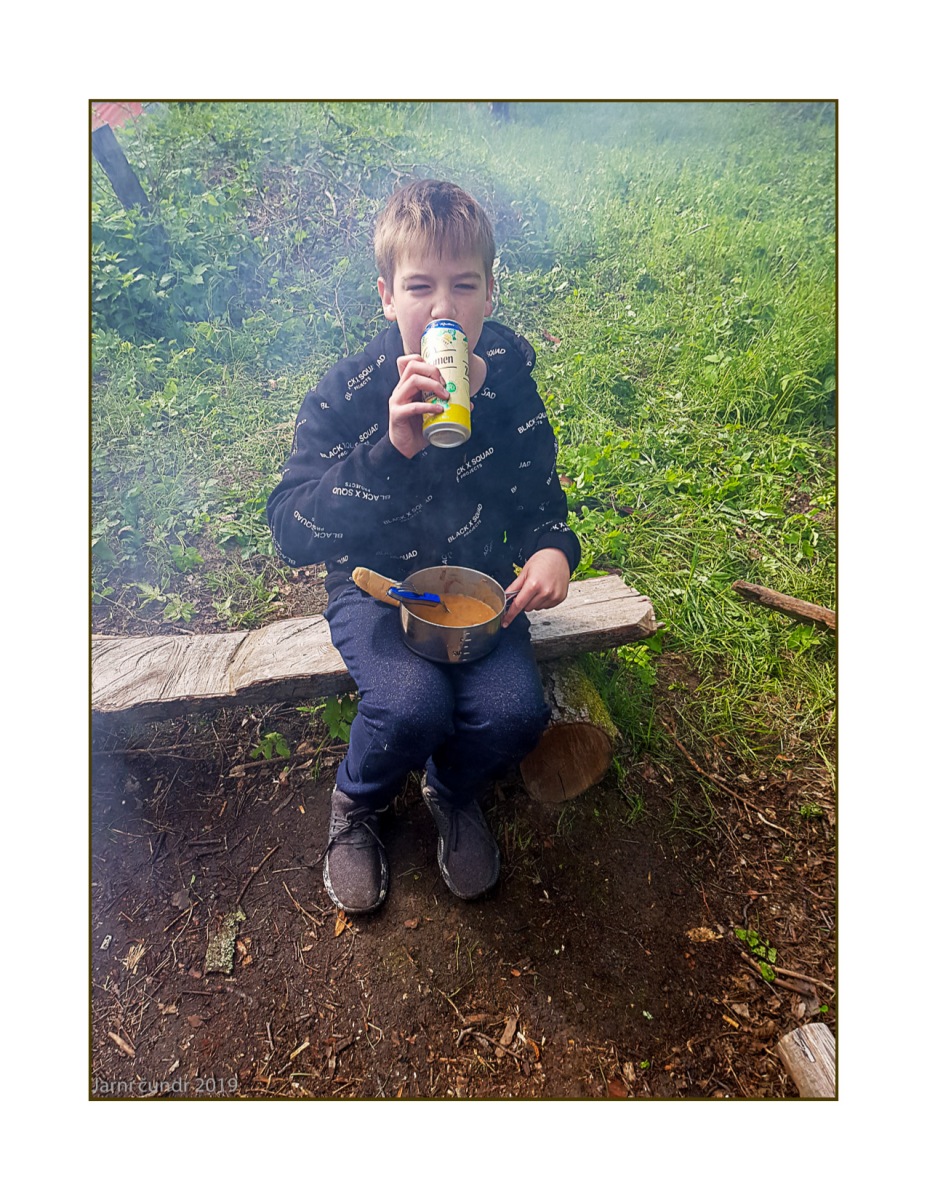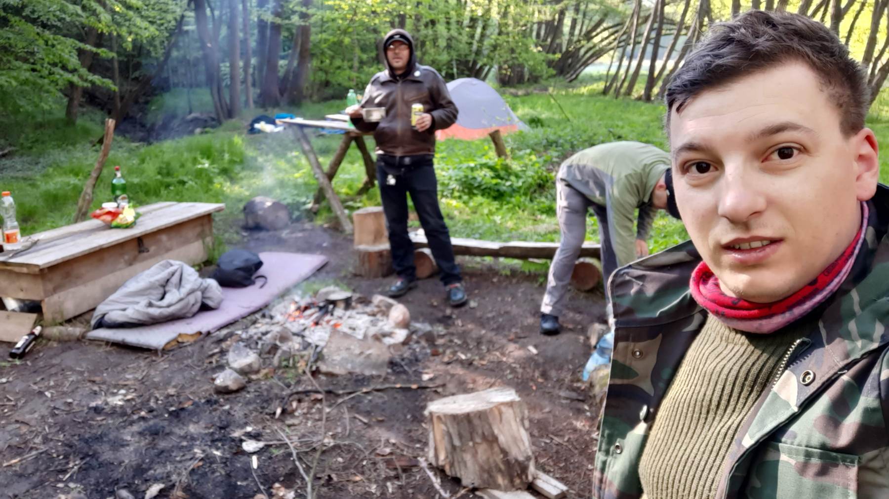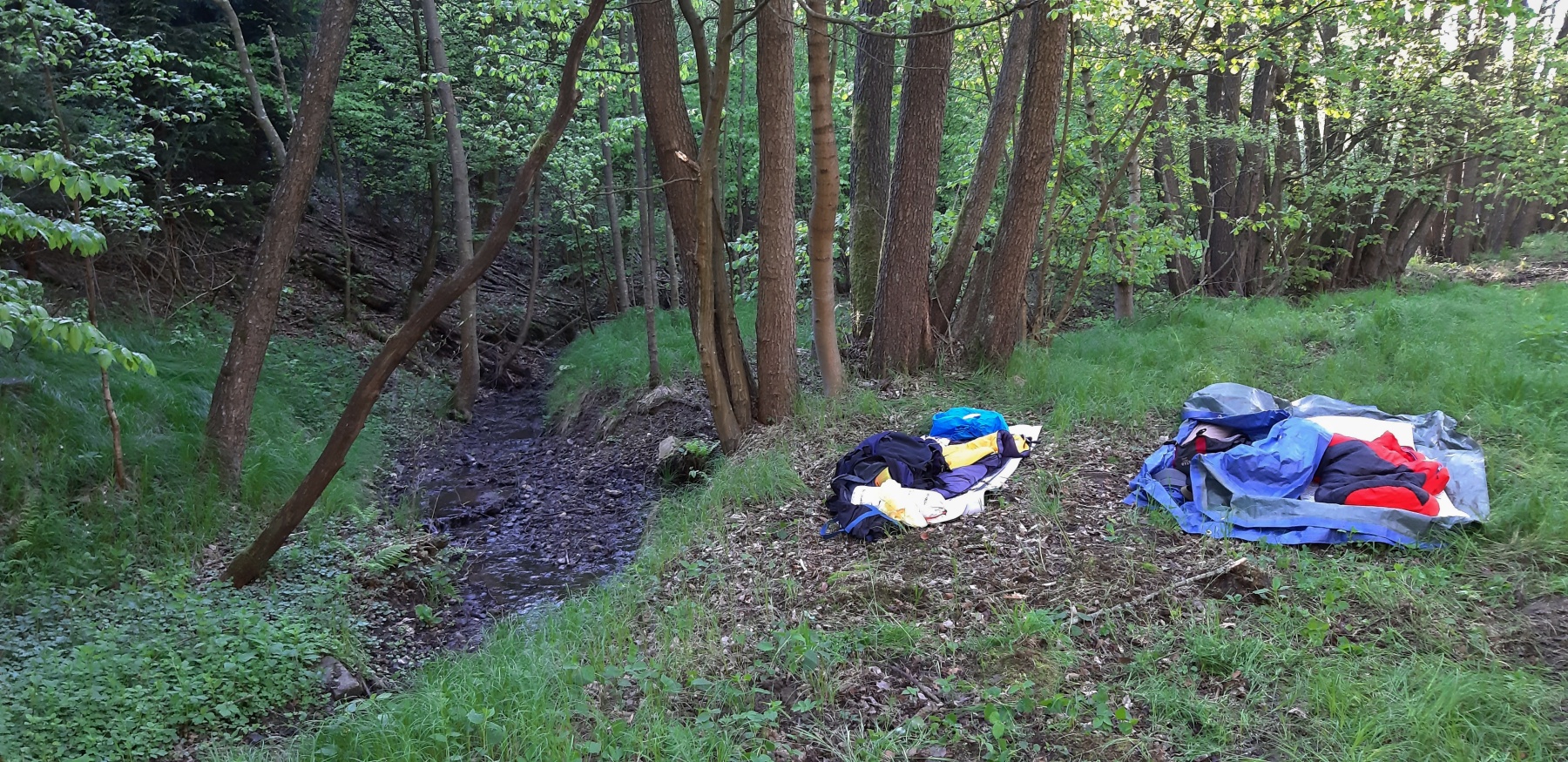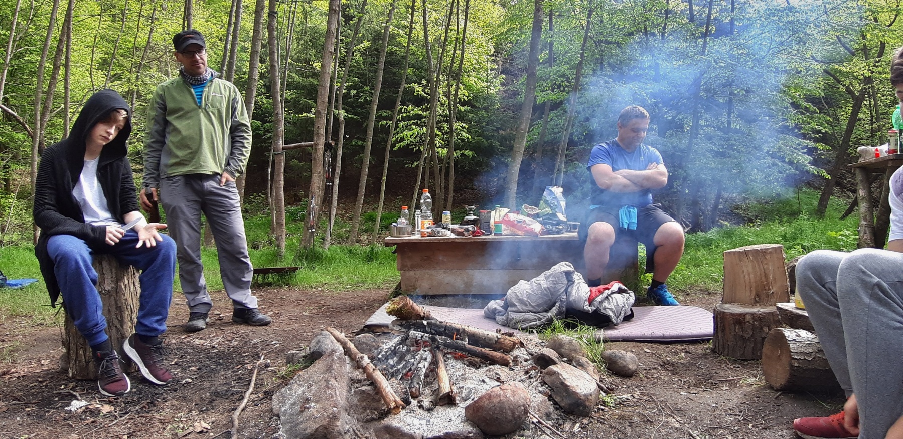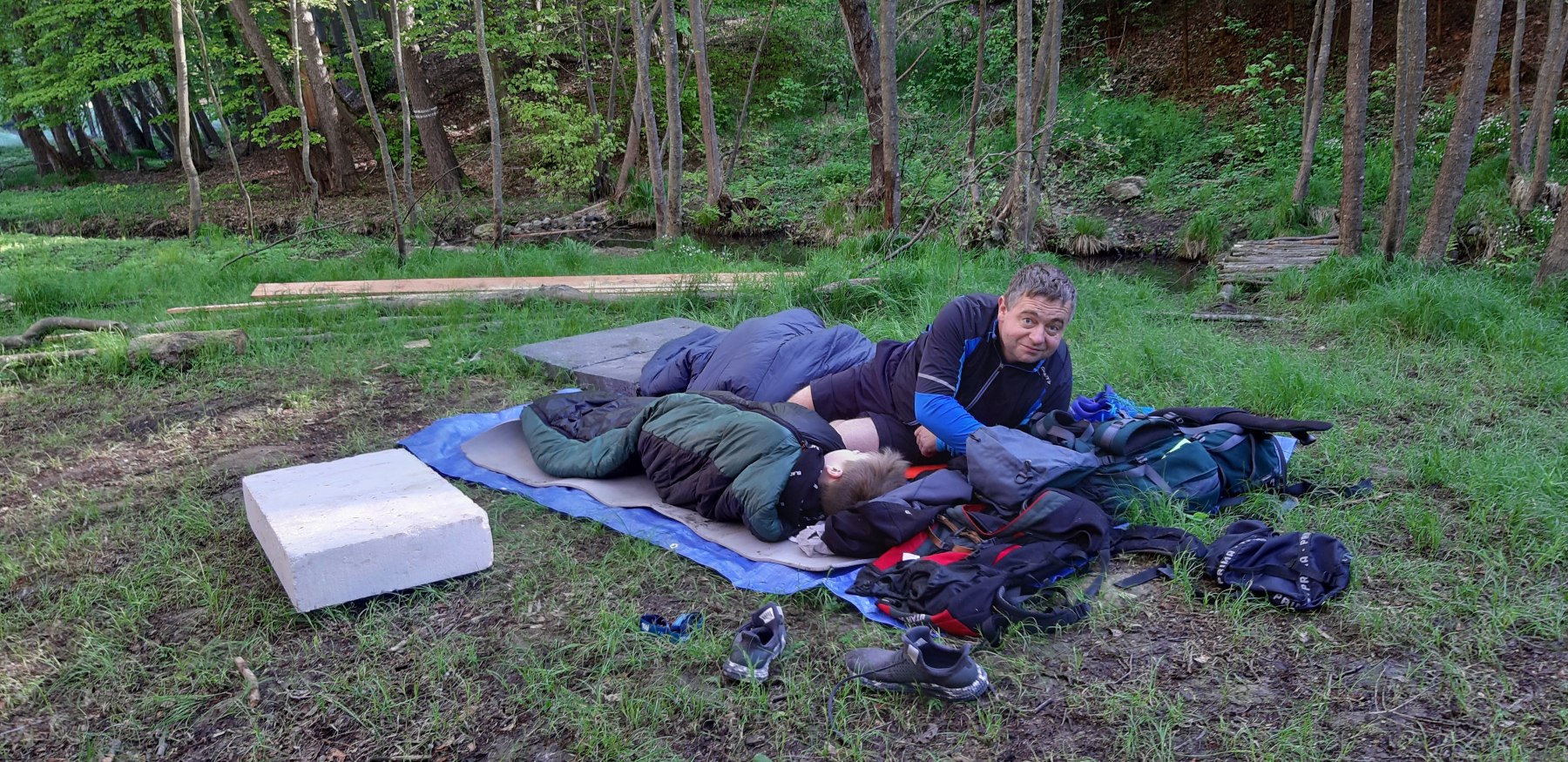 Teplota je tak akorát a ráno se nám probudilo do prvotřídního slunečna. Rozděláváme oheň z uhlíků z předchozí noci a vaříme kafe. Dnešním cílem je oběd a pivko na Bukovince. Není to daleko, takže vlastně není kam spěchat a oheň hoří hezky. Někteří odvážní si zkouší elektrochopper a po chvíli už si jdeme každý po svém.