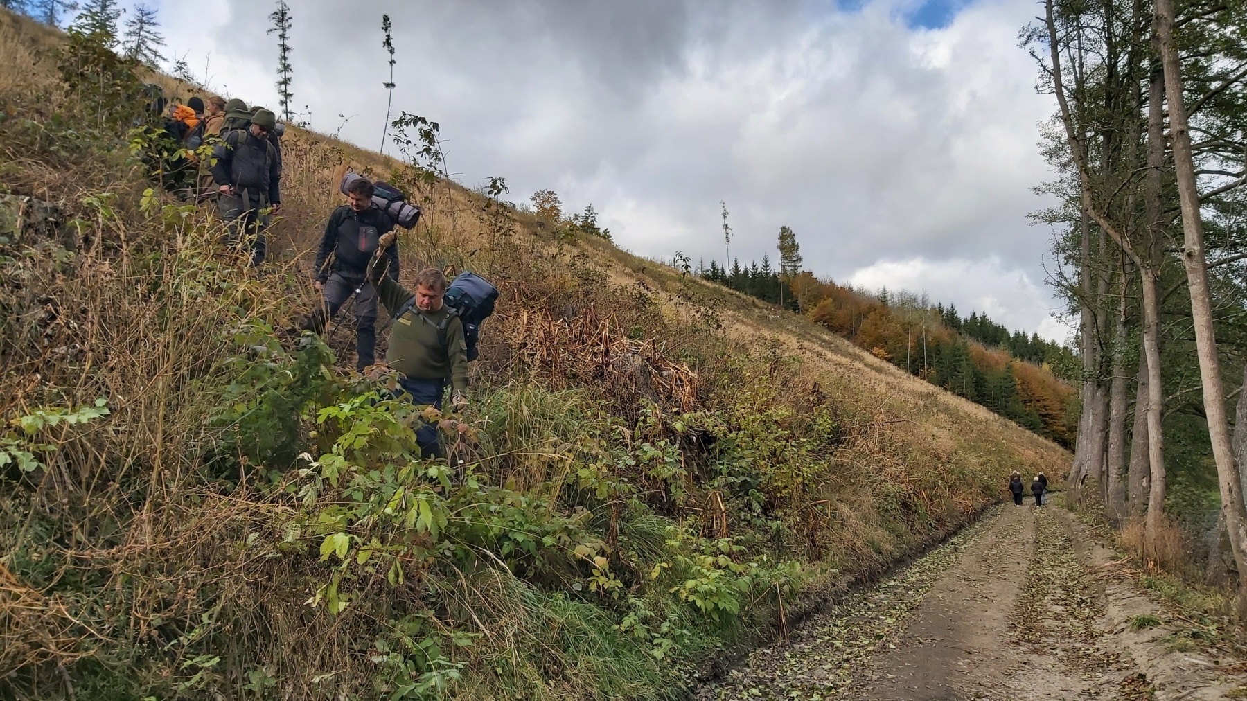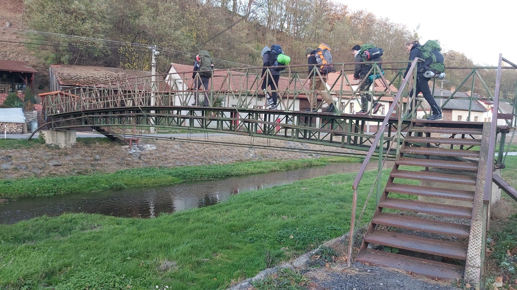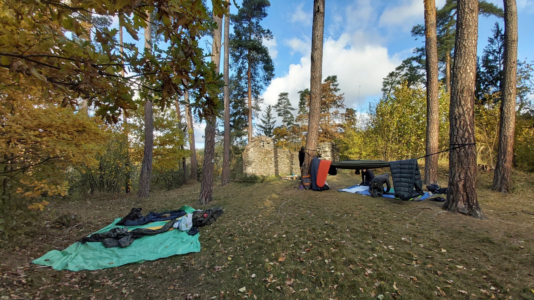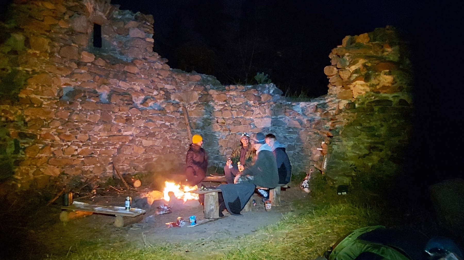 V buse panuje napjatá dobrá nálada a podáváme si kanystřík s ohnivou vodou, aby nám cesta rychleji utíkala. Po půlhodince jízdy vystupujeme ve Strážku, nahazujeme batohy a hurá na místo prvního noclehu. Moc kilometrů nás nečeká, protože plánujeme spát na zřícenině hradu Mitrov. I tak ale pomalu padá slunko a chtěli bychom být v cíli ještě za světla, což se nakonec daří.