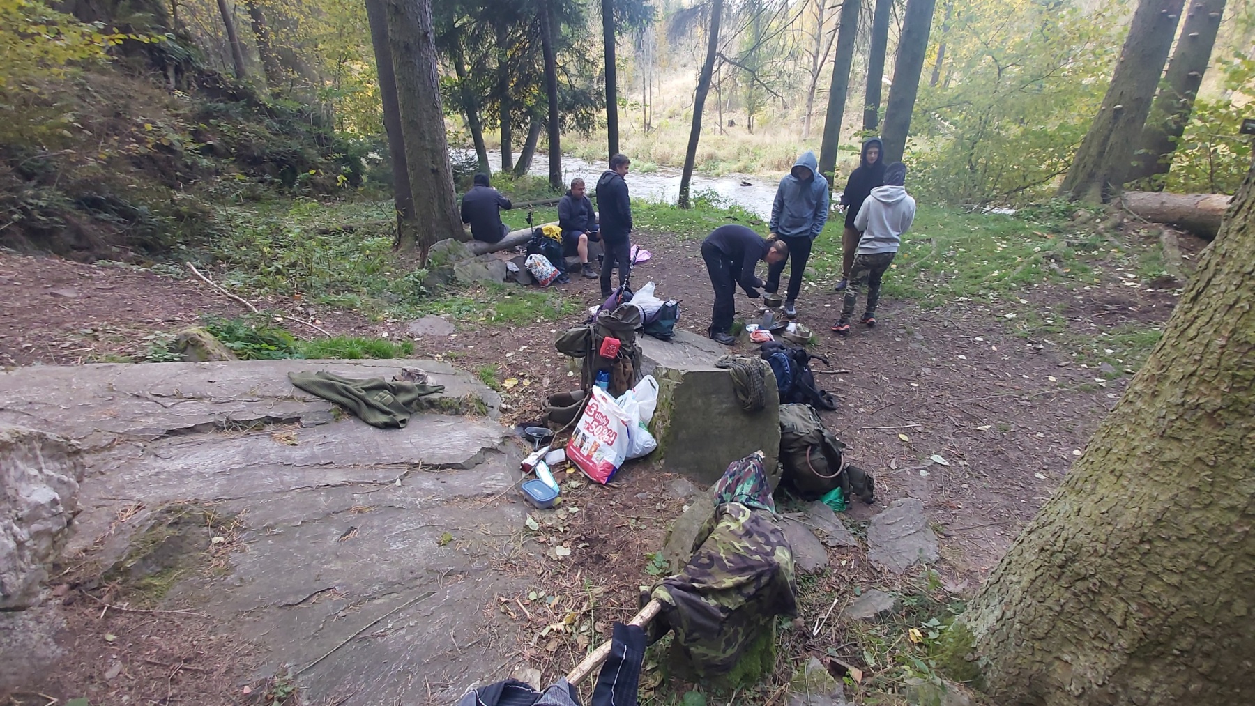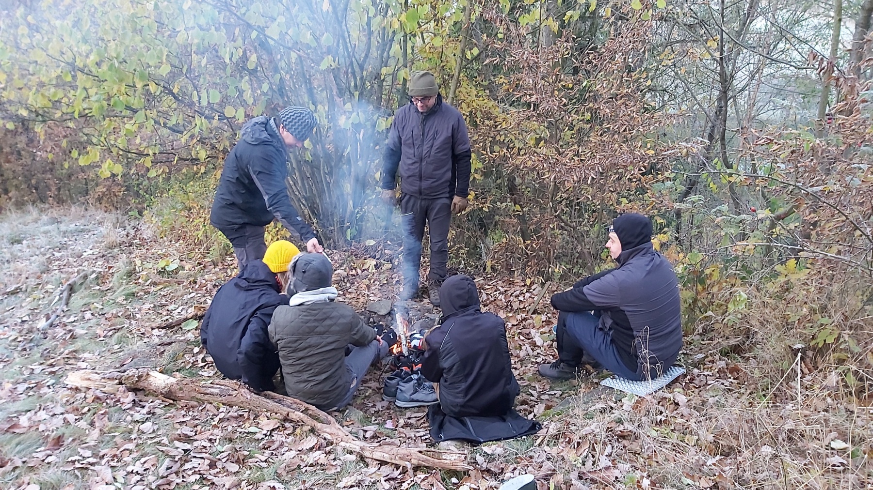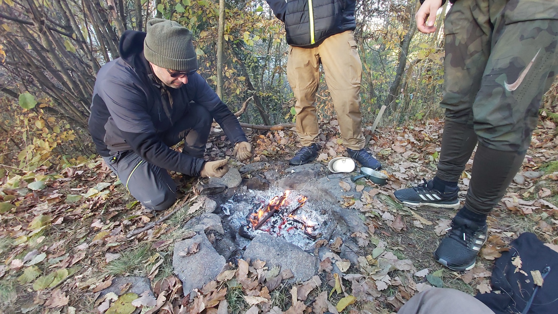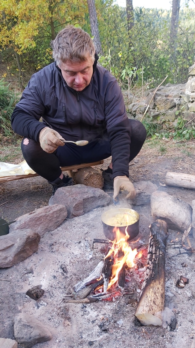 Po příchodu jsme trošku skeptičtí ohledně ohně, protože se zpočátku nedaří najít dřevo. Nakonec to chce ale jenom popojít o kousek dál nacházíme ho hromady. Kluci nanosili lavičky od druhého ohniště, Radim řádí s pilkou a já chystám a zapaluju oheň. Vytahujeme zásoby, ešusy a hrnky a vaříme, ohřívámě a opíkáme co je. Dlabanec na ohni chutná vžycky nejlíp a tentokrát tomu není jinak.