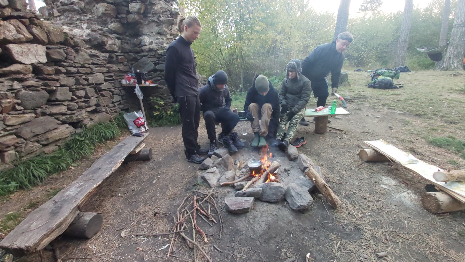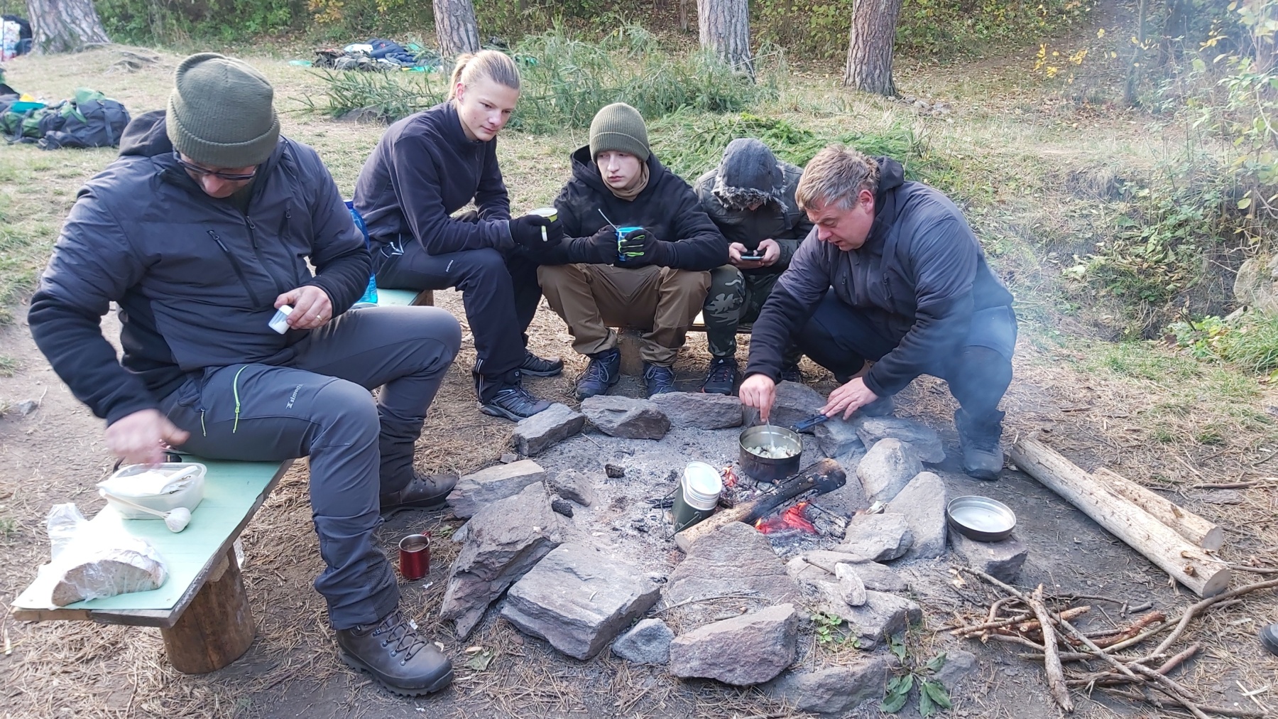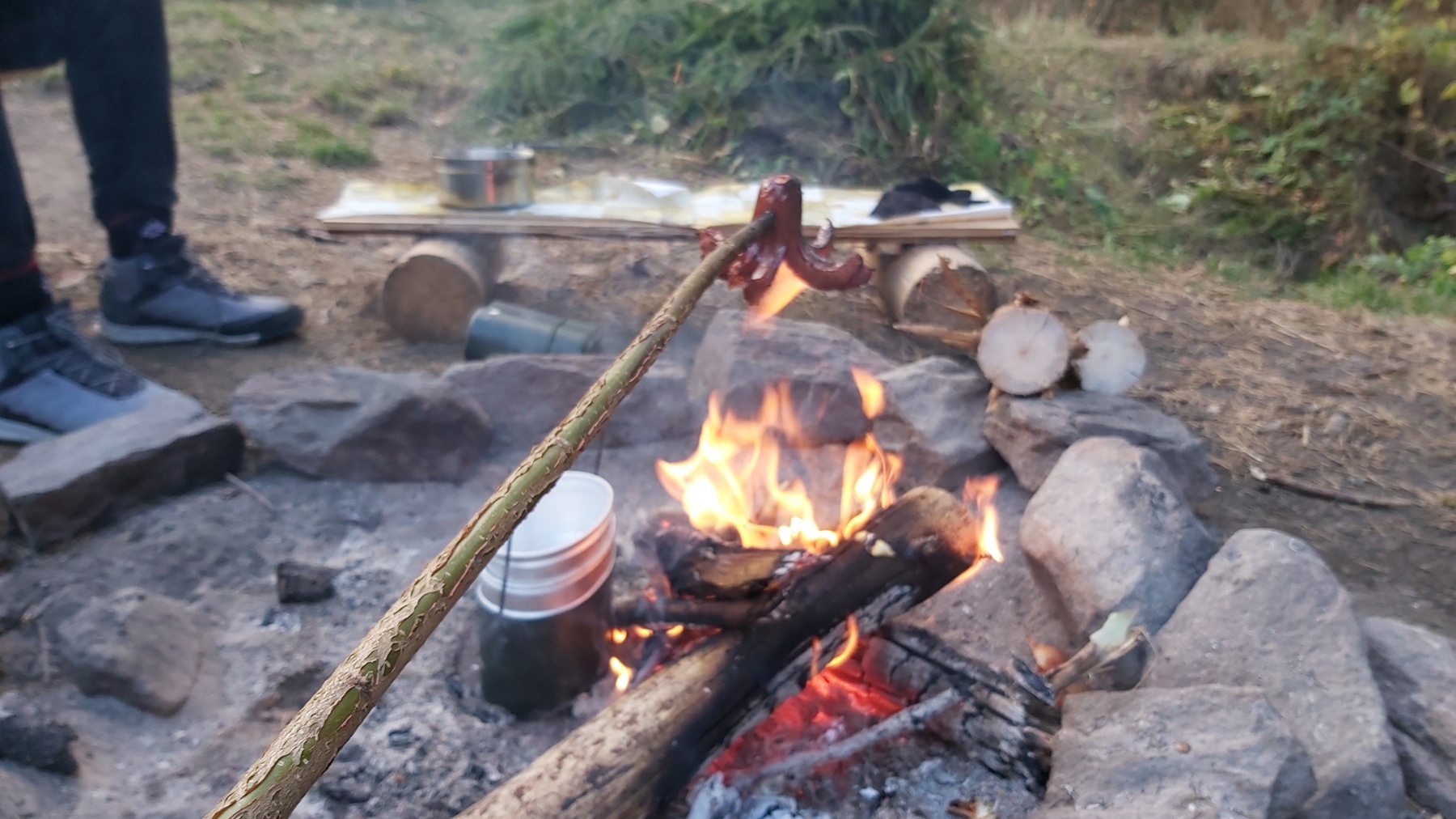 Po příchodu jsme trošku skeptičtí ohledně ohně, protože se zpočátku nedaří najít dřevo. Nakonec to chce ale jenom popojít o kousek dál nacházíme ho hromady. Kluci nanosili lavičky od druhého ohniště, Radim řádí s pilkou a já chystám a zapaluju oheň. Vytahujeme zásoby, ešusy a hrnky a vaříme, ohřívámě a opíkáme co je. Dlabanec na ohni chutná vžycky nejlíp a tentokrát tomu není jinak.
