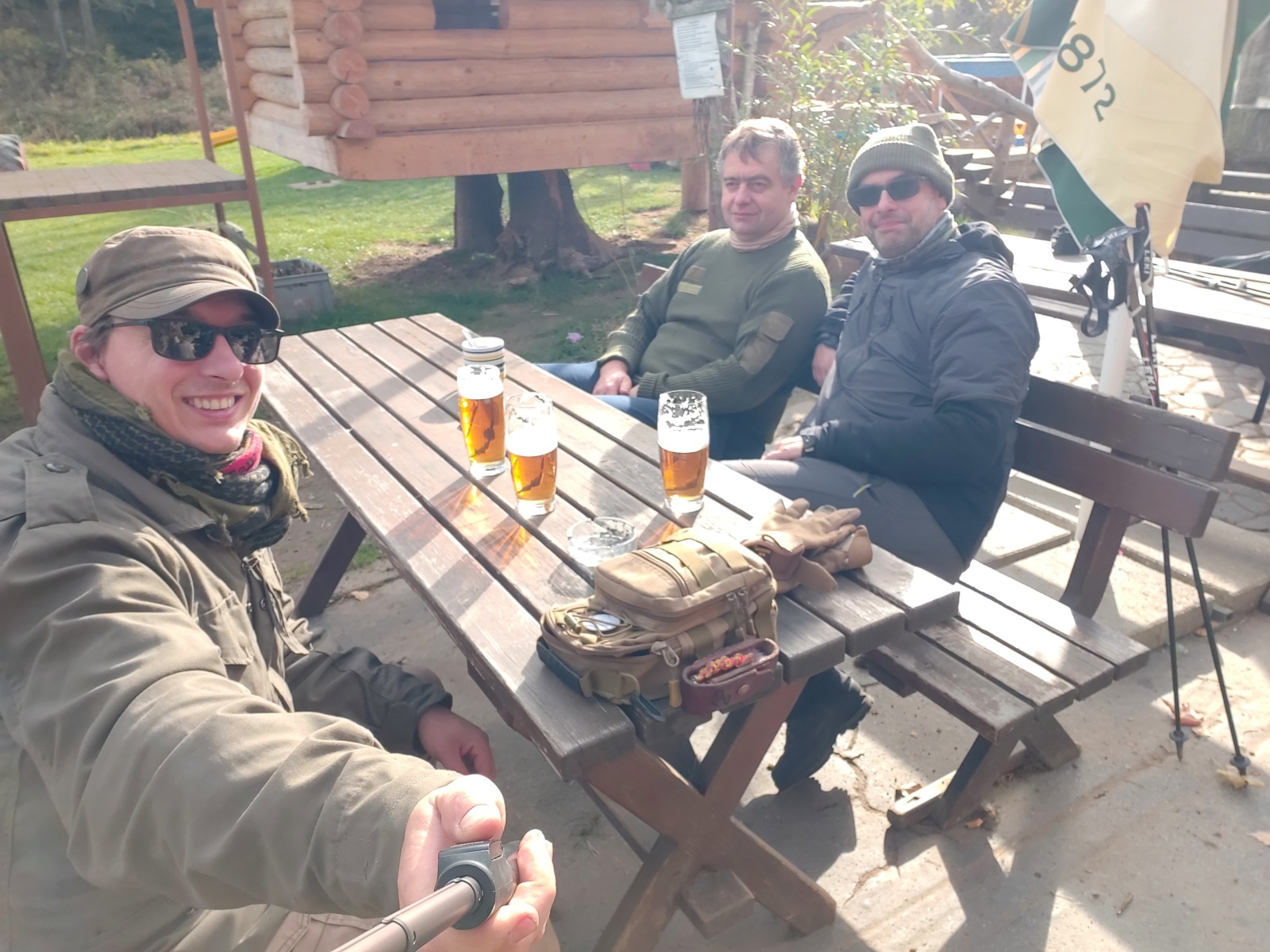 Po desáté už velíme k odchodu a jdeme dolů na Podmitrov. Přicházíme na důvod ustavičného štěkotu – probíhá tam výcvik obranářských psů. Restaurace je otevřená, takže sedáme na krátké občerstvení. Během chvilky volá Hvozdík, kde jsme a že u nás cca za půhodiny bude. Doplňujeme vodu, kupujeme občerstvení a bavíme se tím, jak kolem nás co chvilku projde nějaké huňaté tele, přičemž nás majitel samozřejmě utvrzuje v tom, že je to ještě štěně.