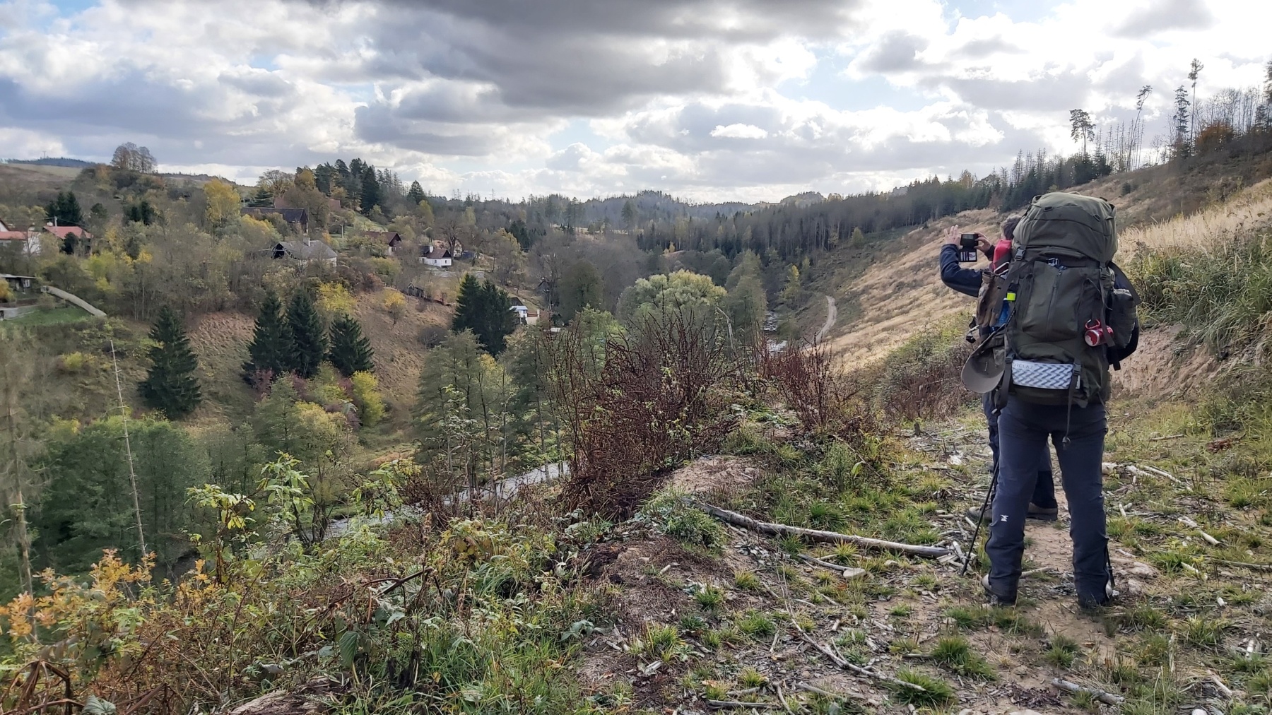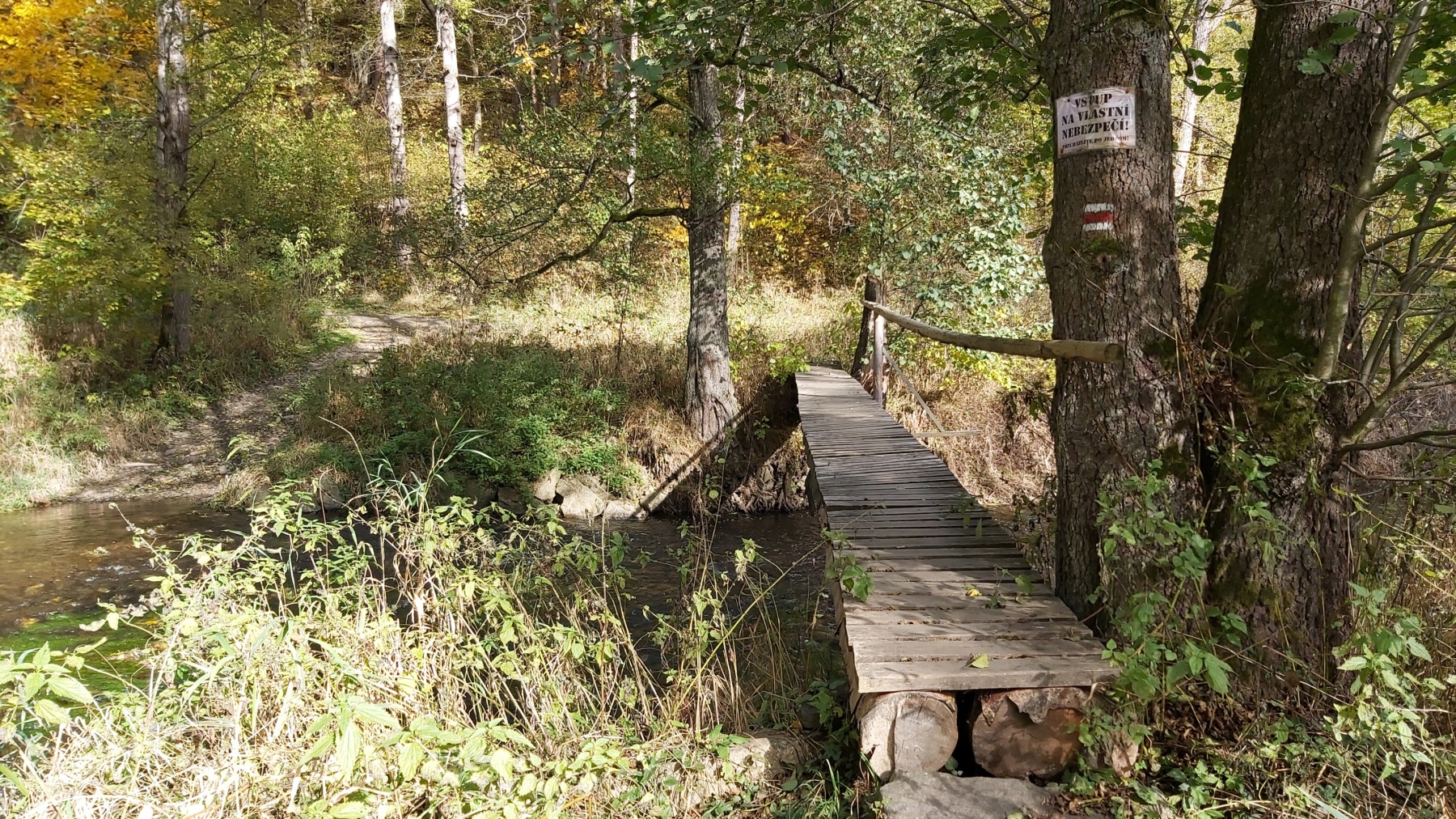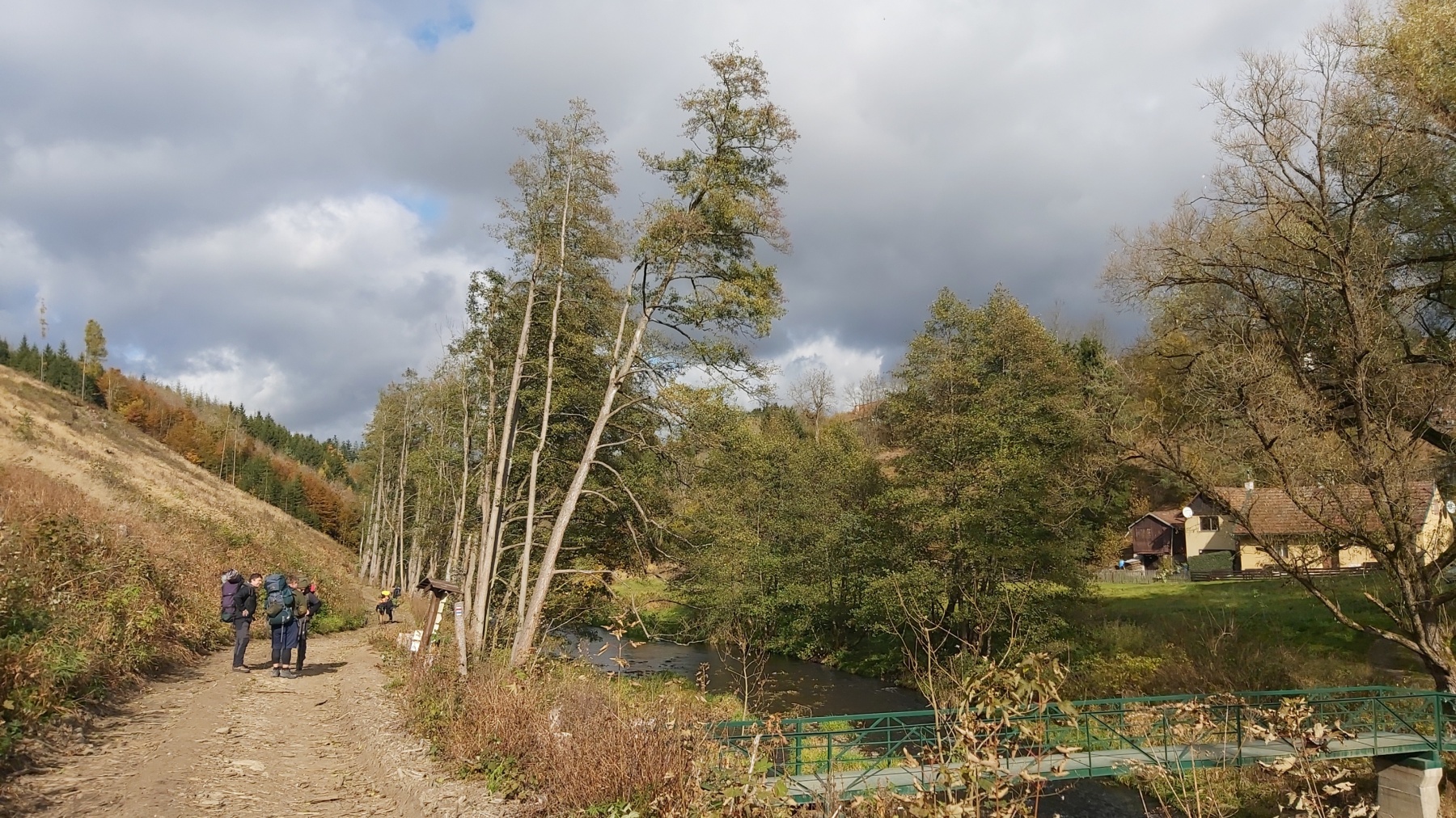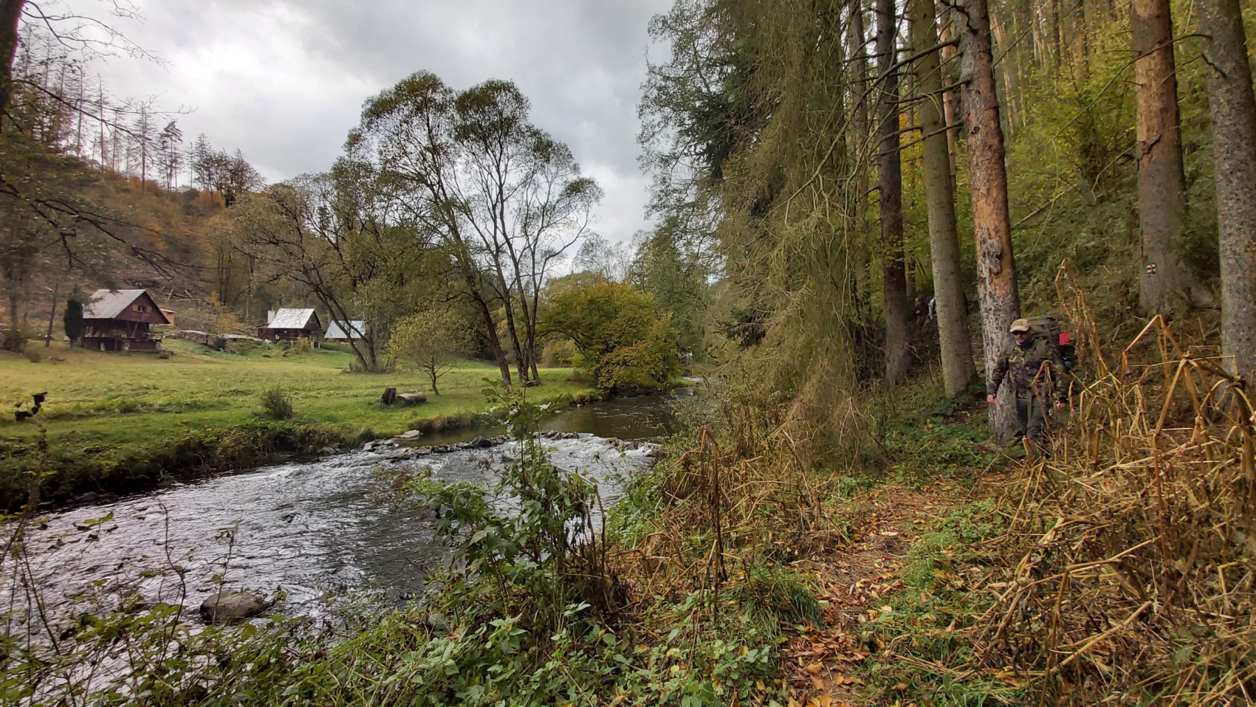 Po příchodu Hvozdíků vyrážíme. Čeká nás nejzajímavější úsek celého vandru. Začíná to tím, že jednou špatně odbočíme, což je ale ve finále k dobru, protože se nám otvírá pohled na údolí, říčku i chatičky nad ní. Abychom mohli pokračovat, musíme ovšem sejít ze svahu divočinou zpátky na stezku. Míjíme Habří a za chvilku jsme u Mariiny studánky. Tempo máme parádní, takže nám nevadí časté zastávky na focení a kochání. A je opravdu čím.