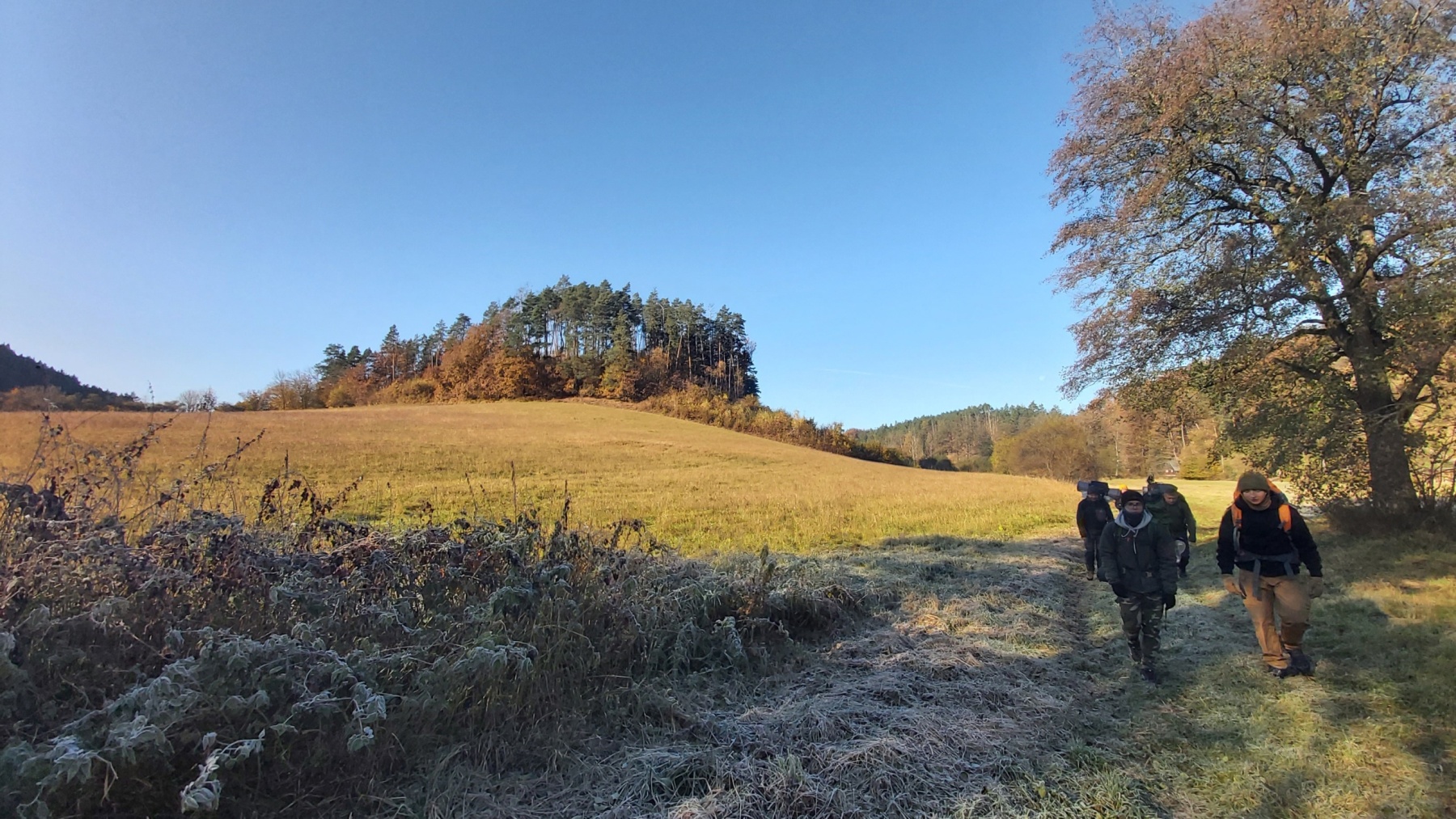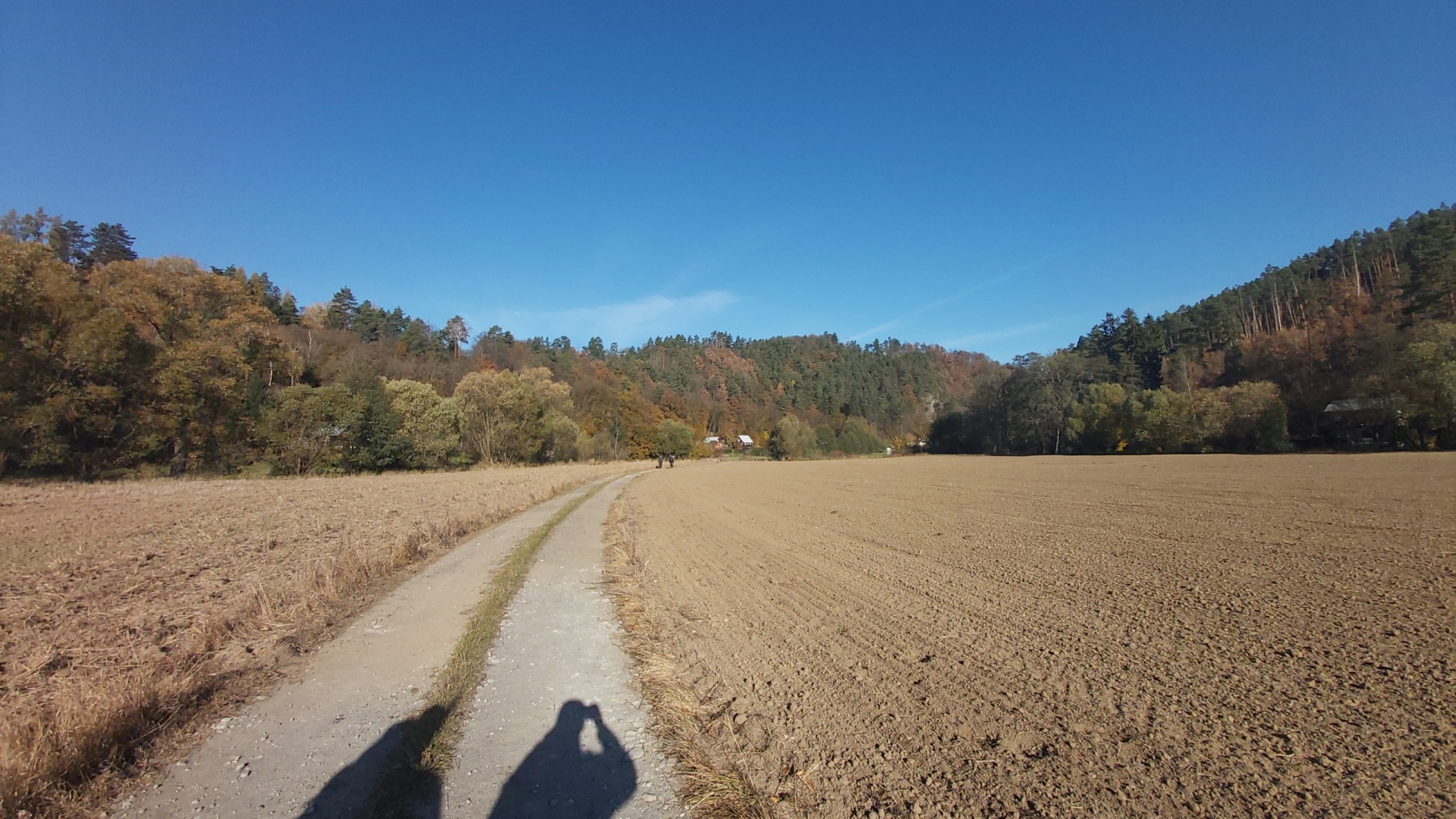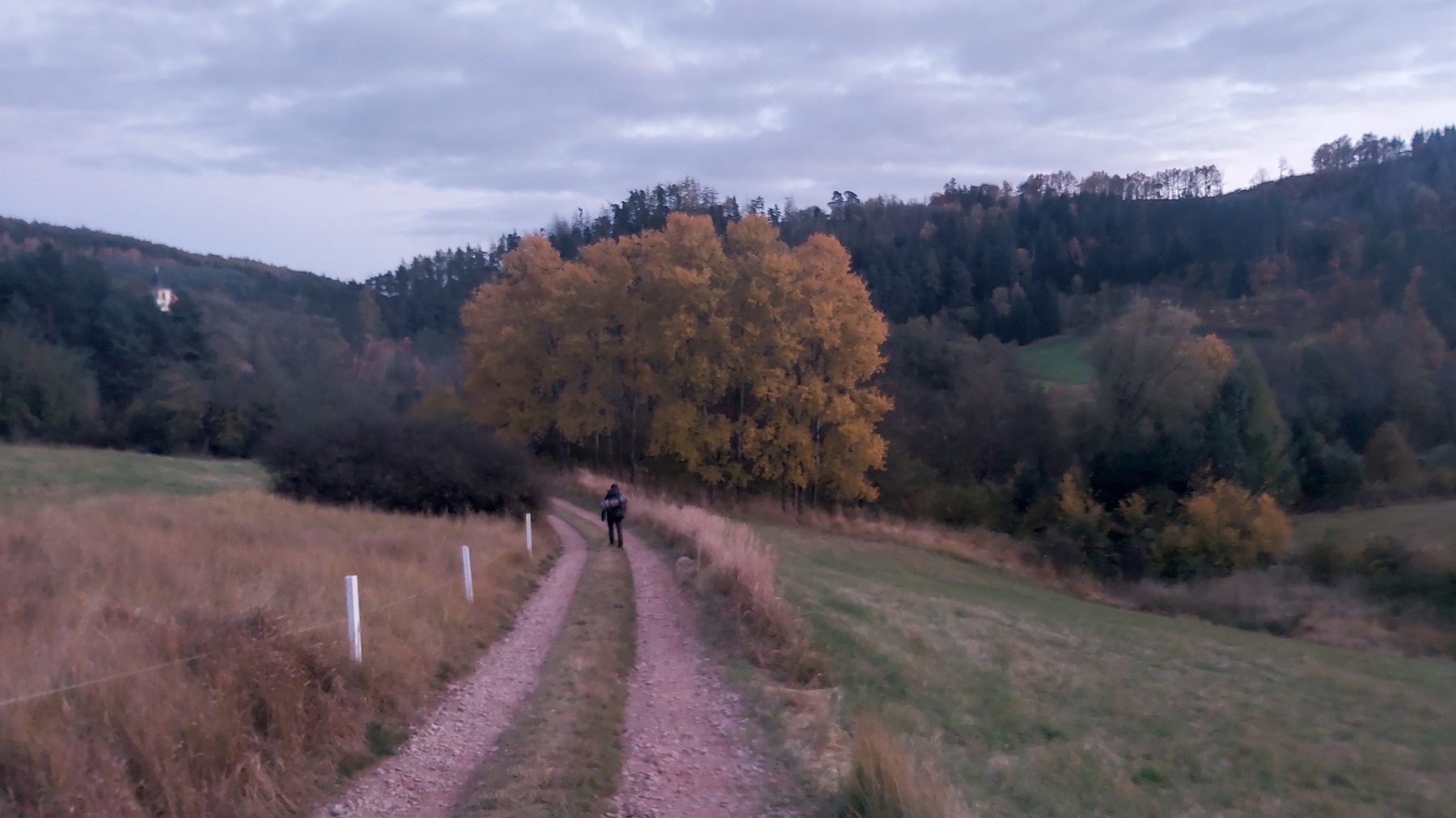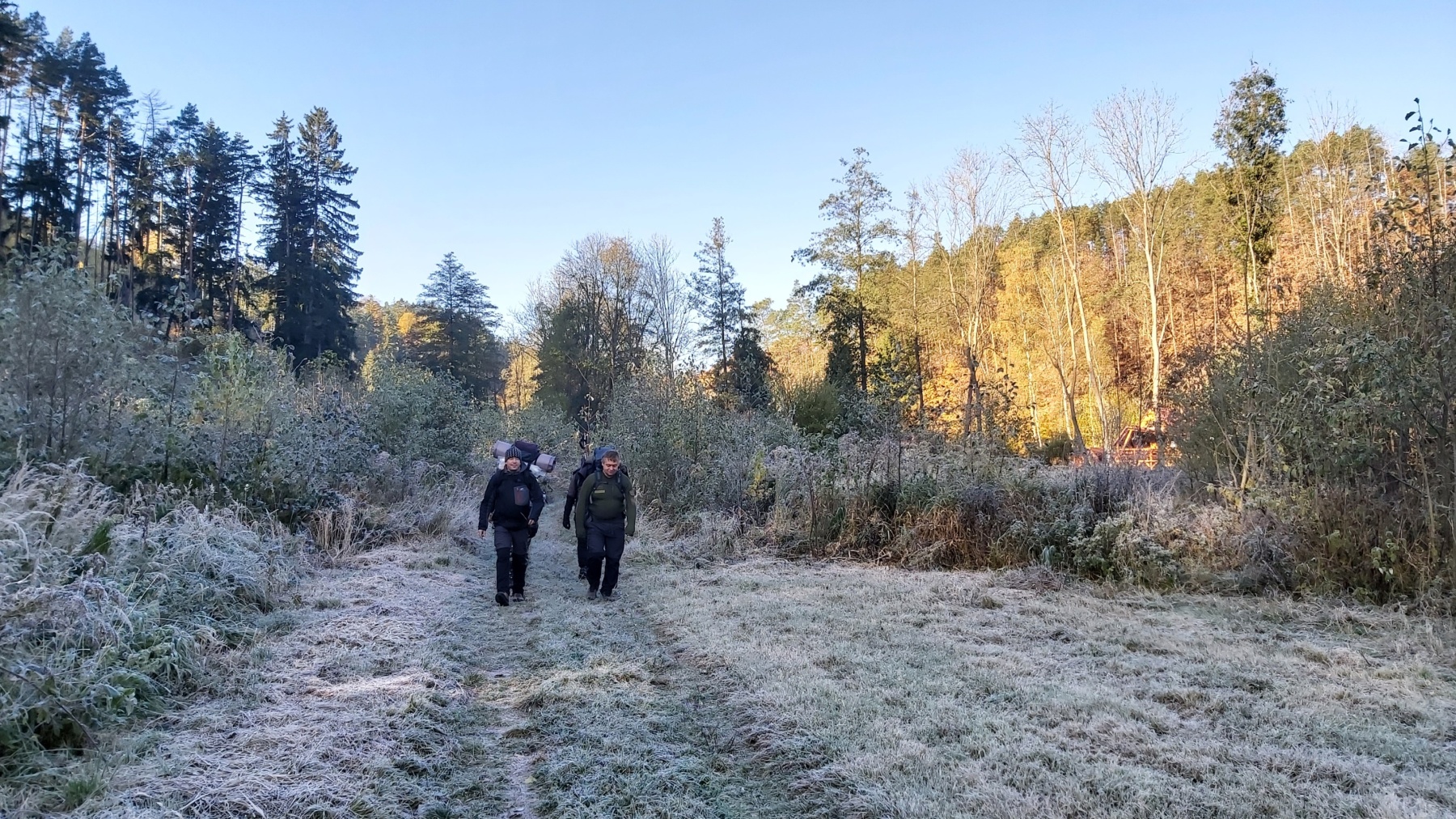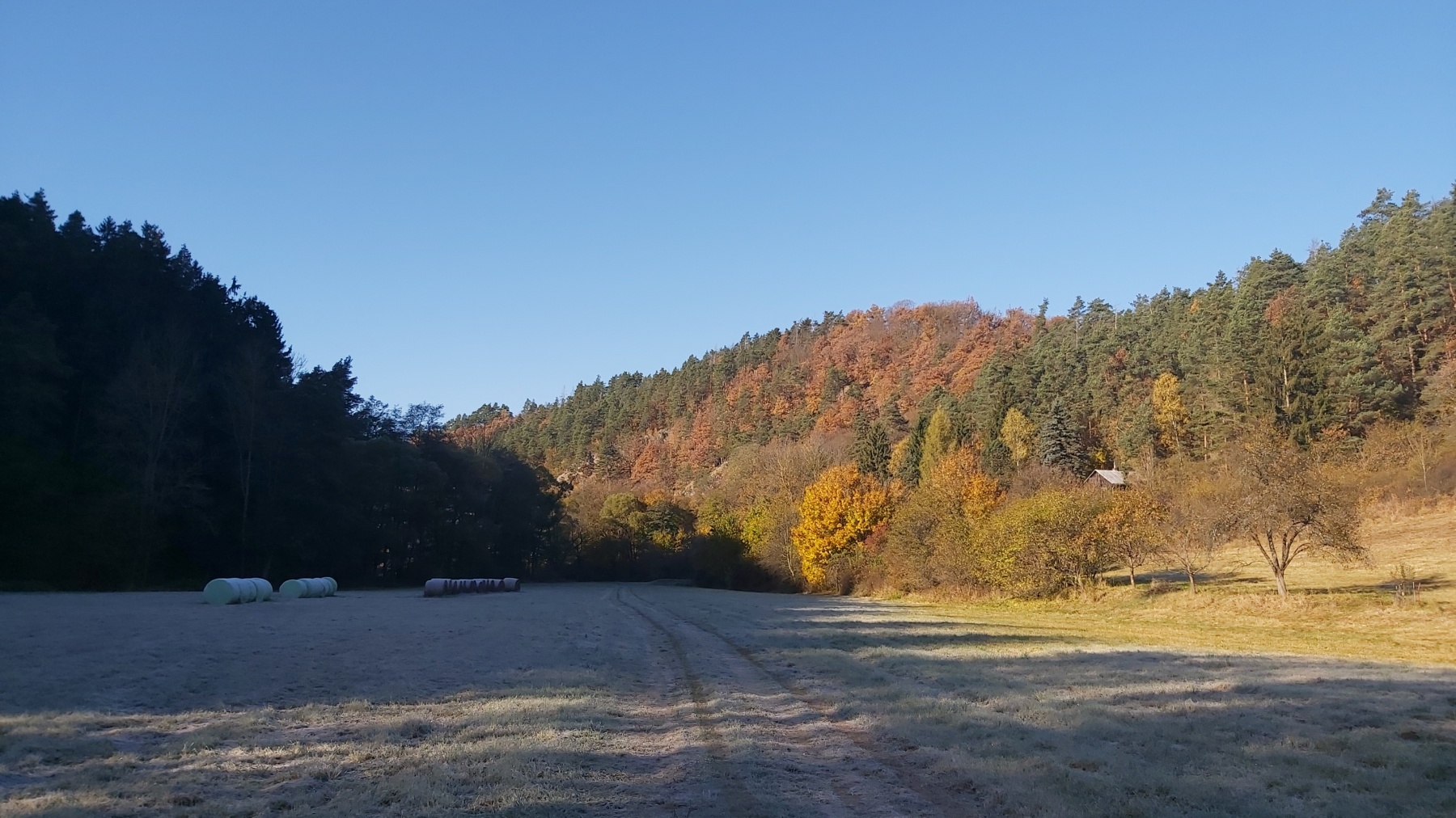 Údolí před námi se pomalu rozevírá a nám se naskytuje pohled na podzimně vybarvené svahy, modrou oblohu a to všechno kontrastující s přírodou, pokrytou jinovatkou tam, kam ještě nedosáhlo slunce. Teď už nás čeká pohodový výšlap po rovince. Slunko nám svítí do tváří, po cestě postupně shazujeme vrstvy oblečení a je nám fajn. Ještě před Újezdem už jdeme jen v tričkách a košilích/mikinách. Tahám z nosu šušeň jak hrom.