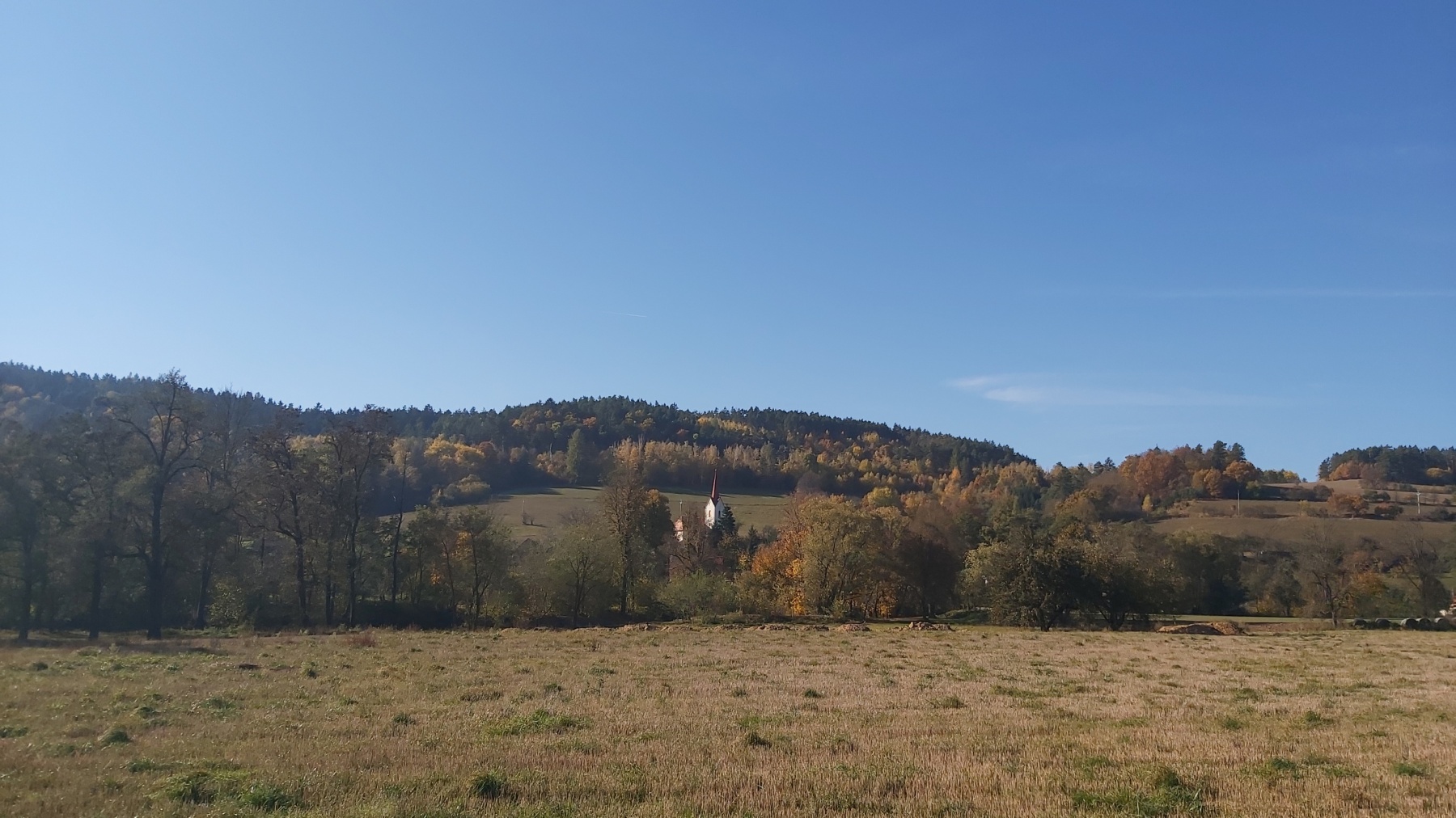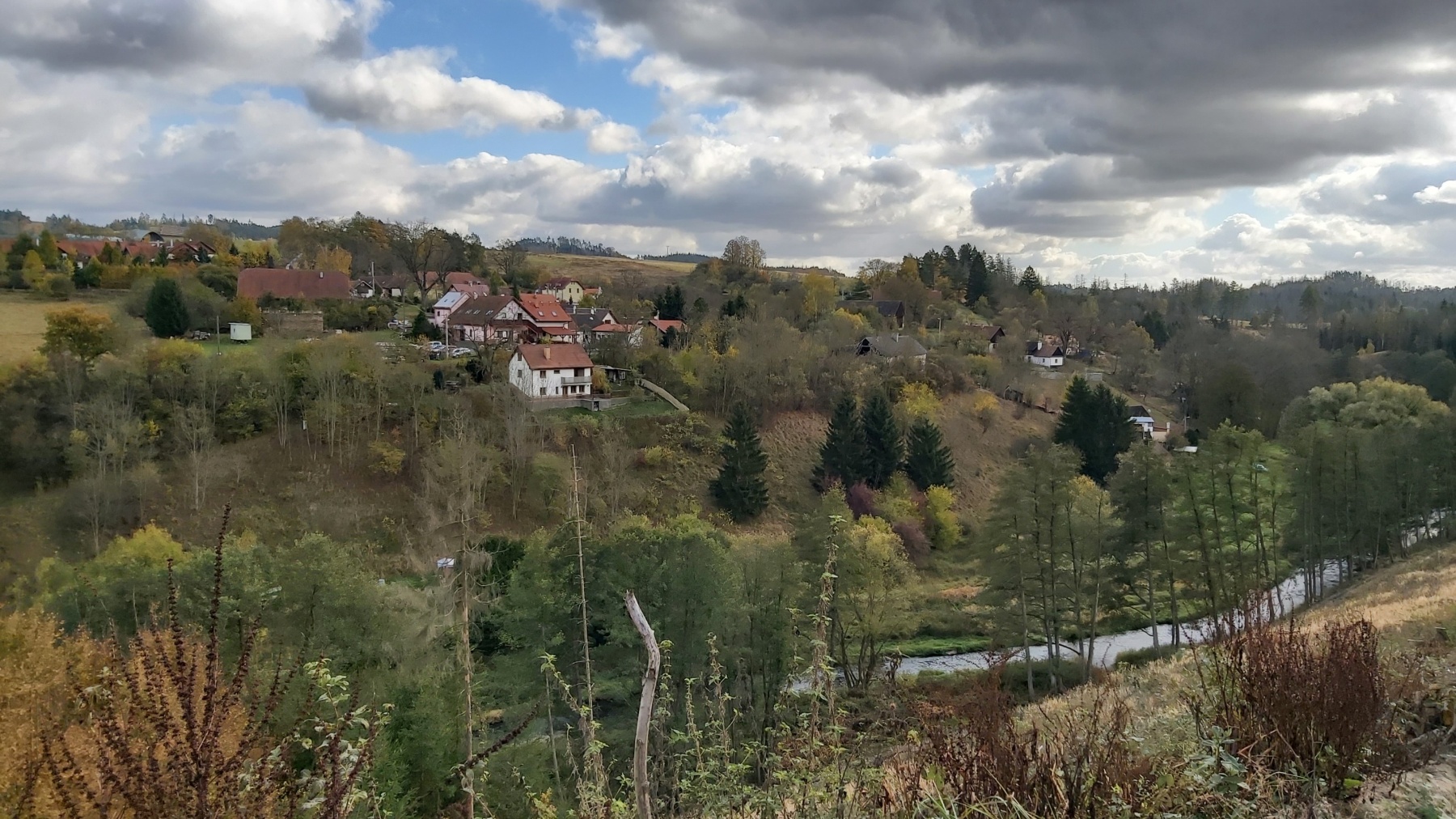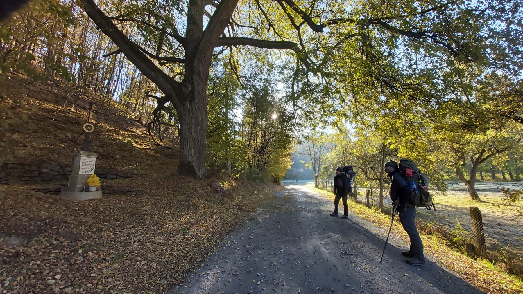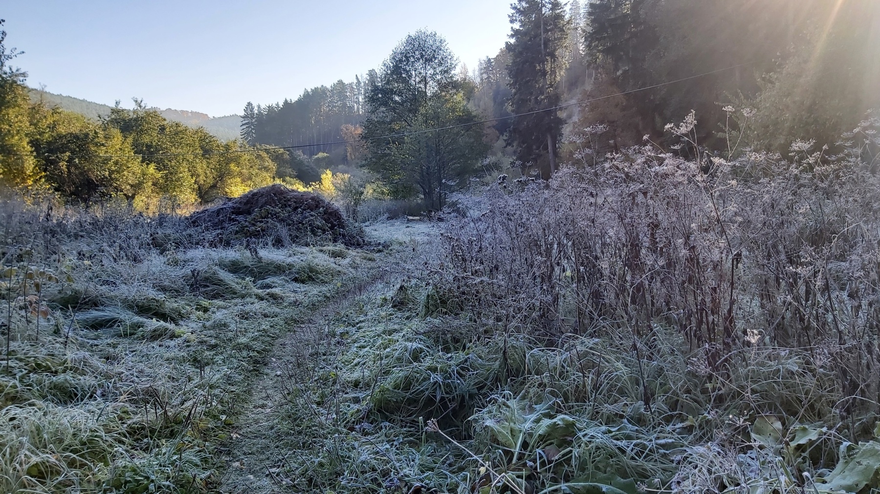 Údolí před námi se pomalu rozevírá a nám se naskytuje pohled na podzimně vybarvené svahy, modrou oblohu a to všechno kontrastující s přírodou, pokrytou jinovatkou tam, kam ještě nedosáhlo slunce. Teď už nás čeká pohodový výšlap po rovince. Slunko nám svítí do tváří, po cestě postupně shazujeme vrstvy oblečení a je nám fajn. Ještě před Újezdem už jdeme jen v tričkách a košilích/mikinách. Tahám z nosu šušeň jak hrom.