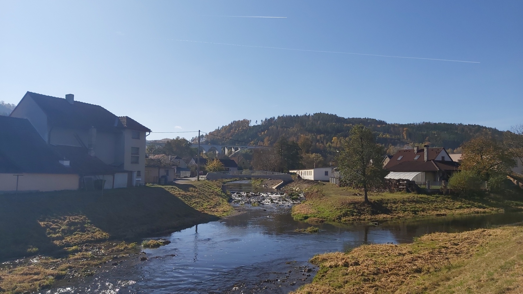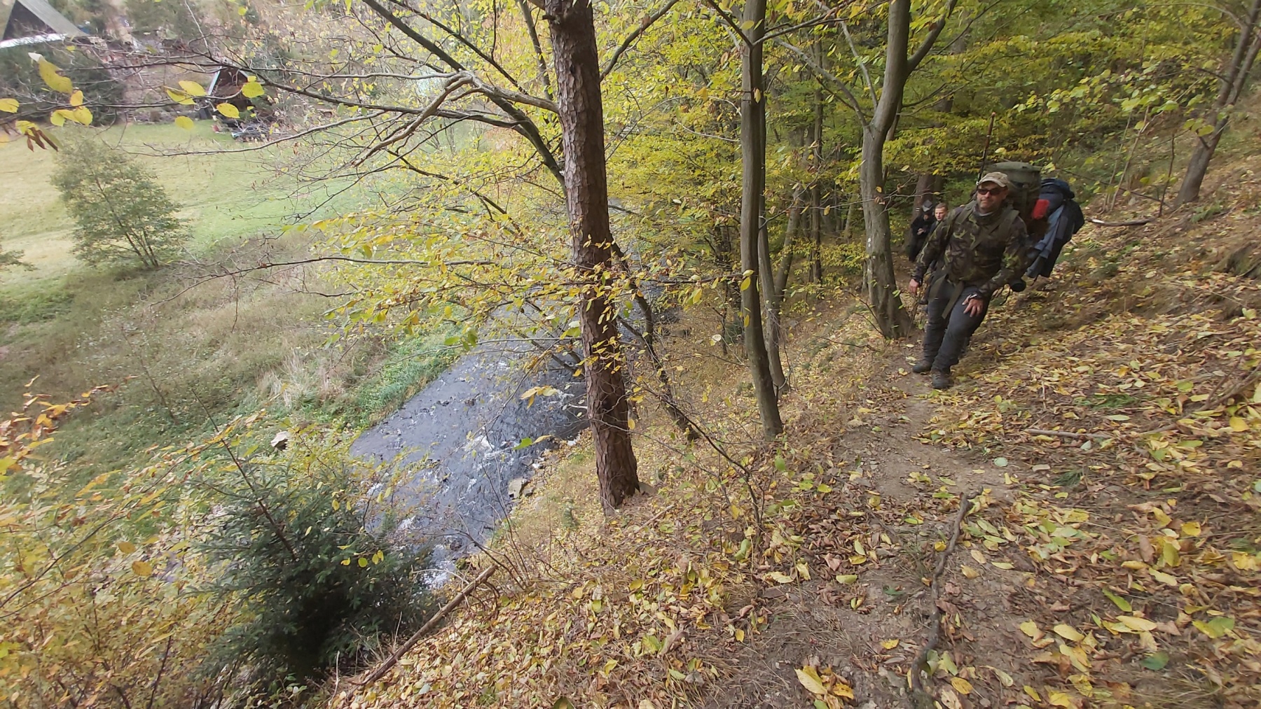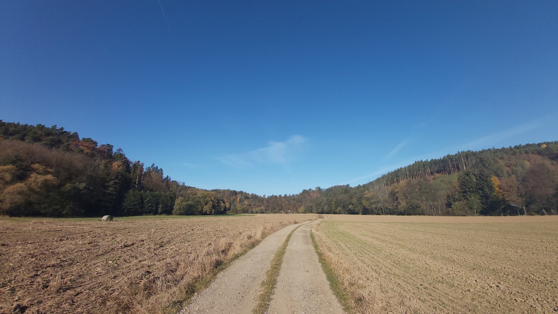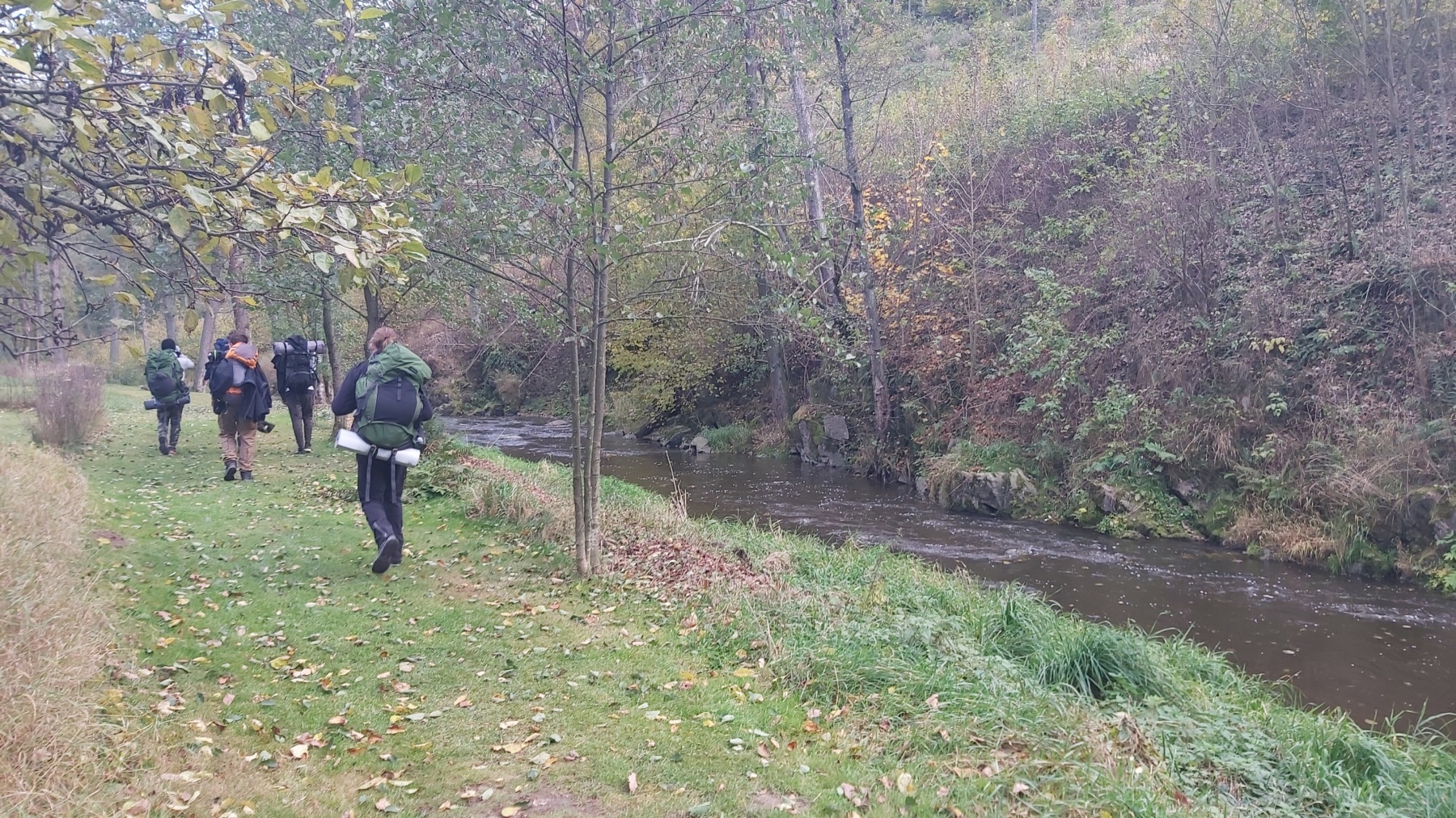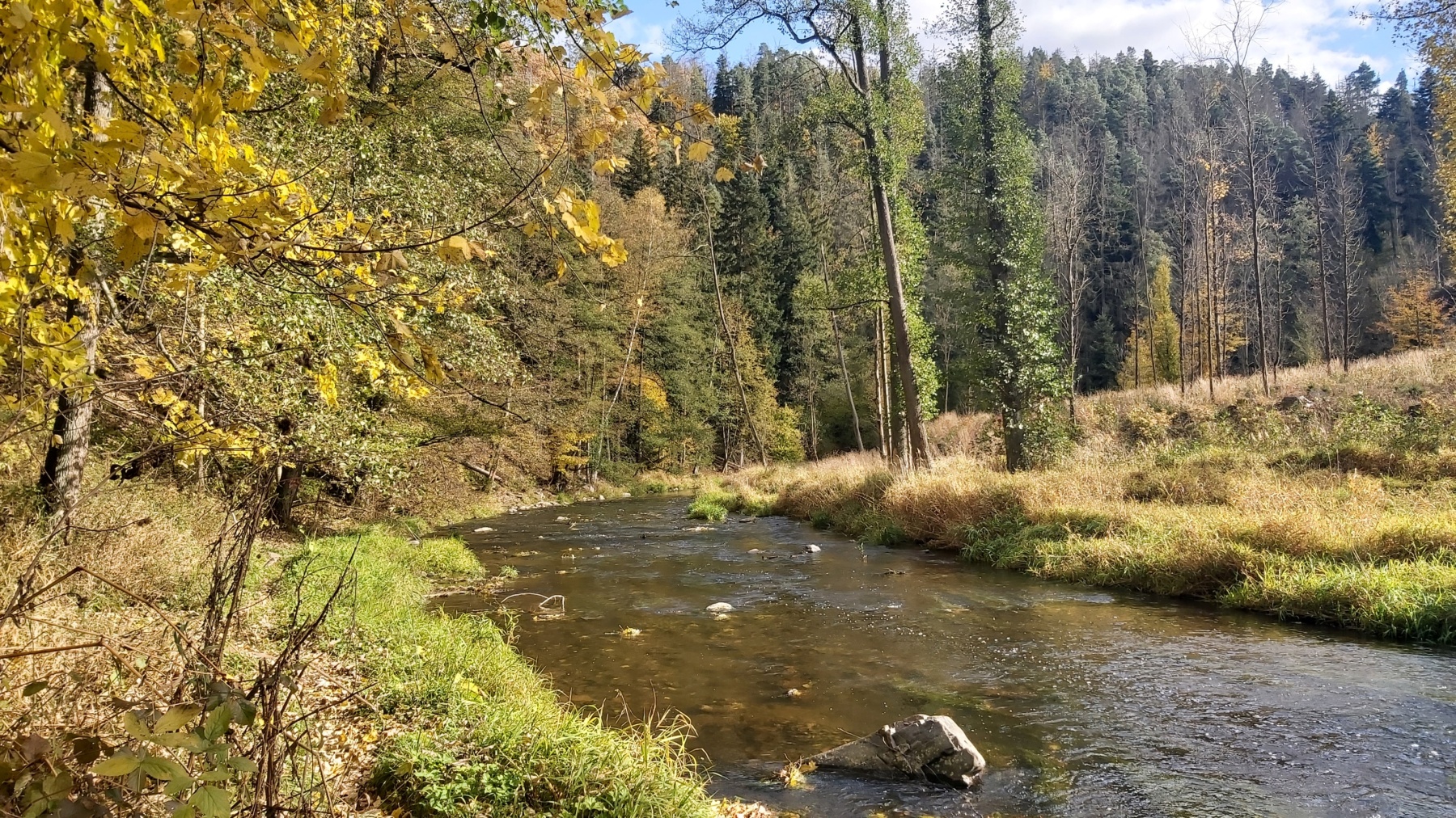 Údolí před námi se pomalu rozevírá a nám se naskytuje pohled na podzimně vybarvené svahy, modrou oblohu a to všechno kontrastující s přírodou, pokrytou jinovatkou tam, kam ještě nedosáhlo slunce. Teď už nás čeká pohodový výšlap po rovince. Slunko nám svítí do tváří, po cestě postupně shazujeme vrstvy oblečení a je nám fajn. Ještě před Újezdem už jdeme jen v tričkách a košilích/mikinách. Tahám z nosu šušeň jak hrom.