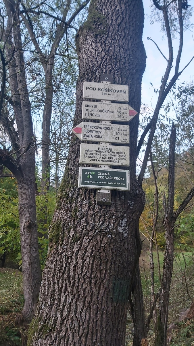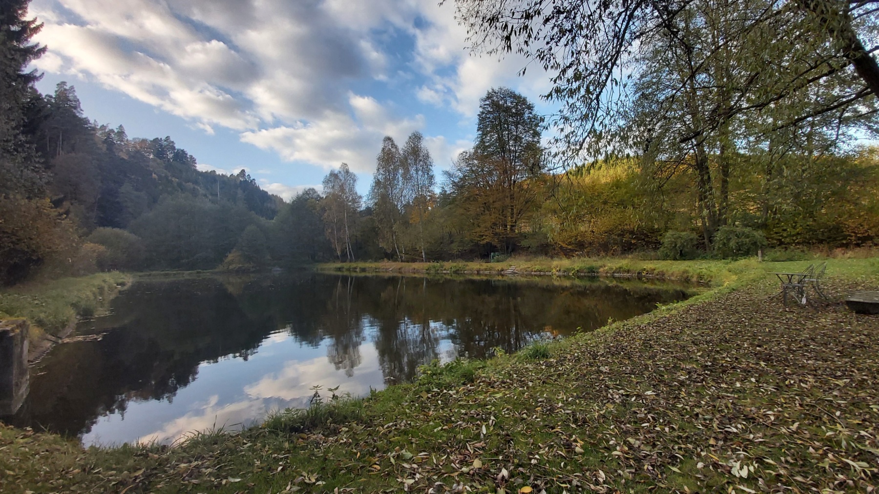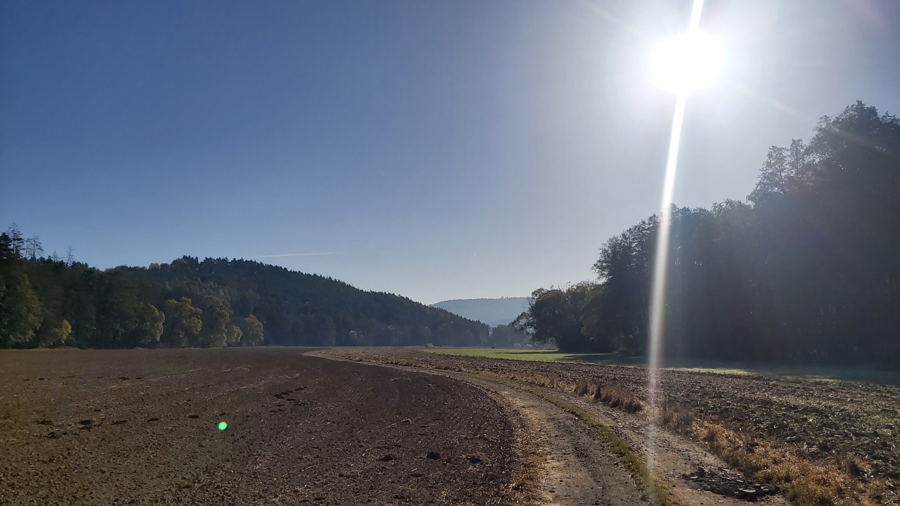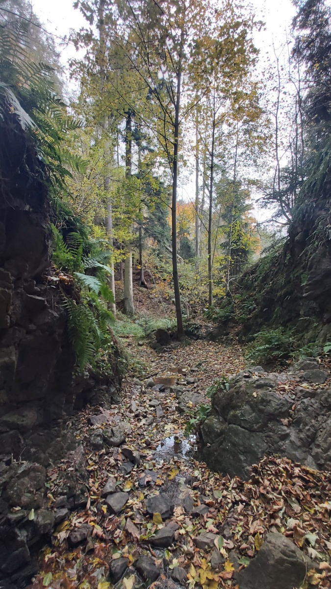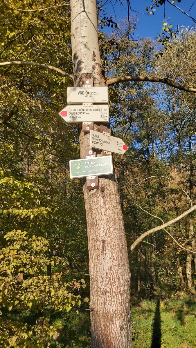 Údolí před námi se pomalu rozevírá a nám se naskytuje pohled na podzimně vybarvené svahy, modrou oblohu a to všechno kontrastující s přírodou, pokrytou jinovatkou tam, kam ještě nedosáhlo slunce. Teď už nás čeká pohodový výšlap po rovince. Slunko nám svítí do tváří, po cestě postupně shazujeme vrstvy oblečení a je nám fajn. Ještě před Újezdem už jdeme jen v tričkách a košilích/mikinách. Tahám z nosu šušeň jak hrom.