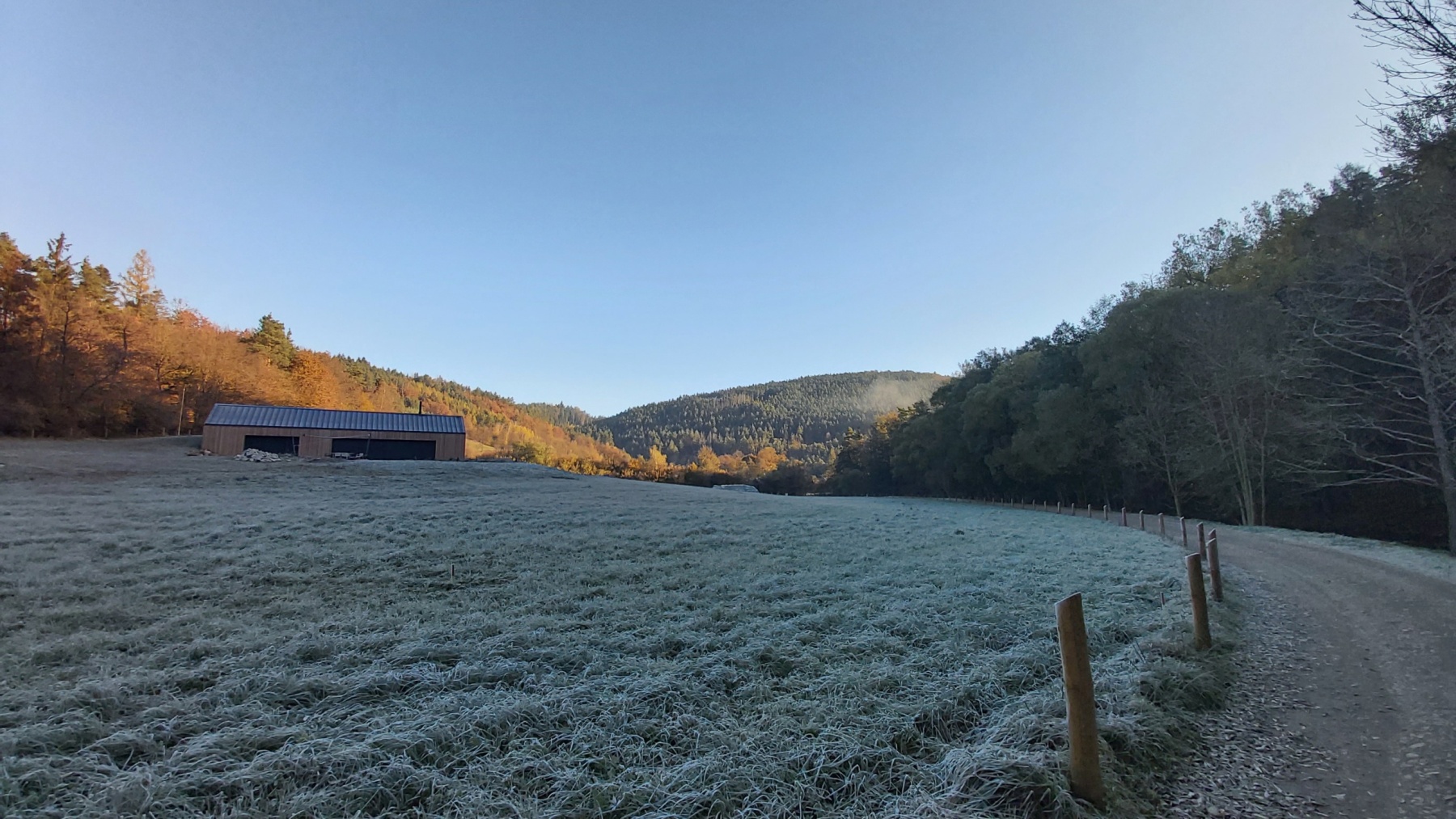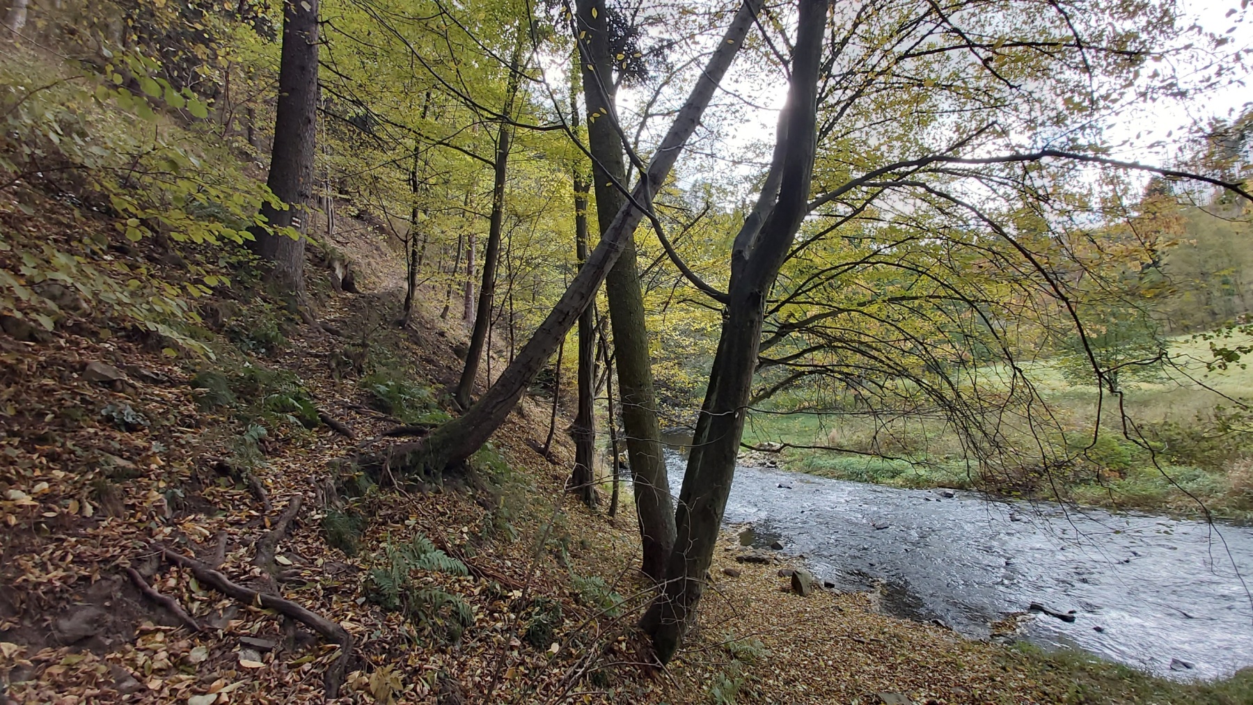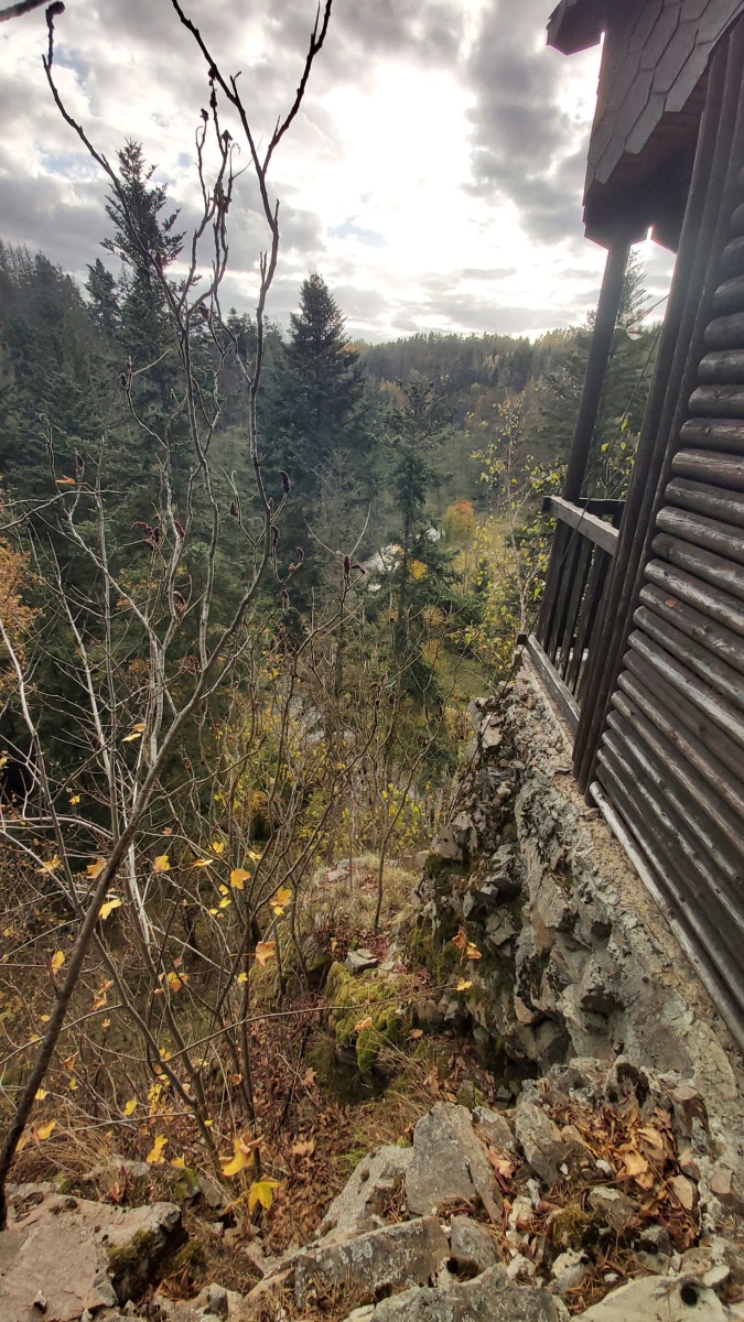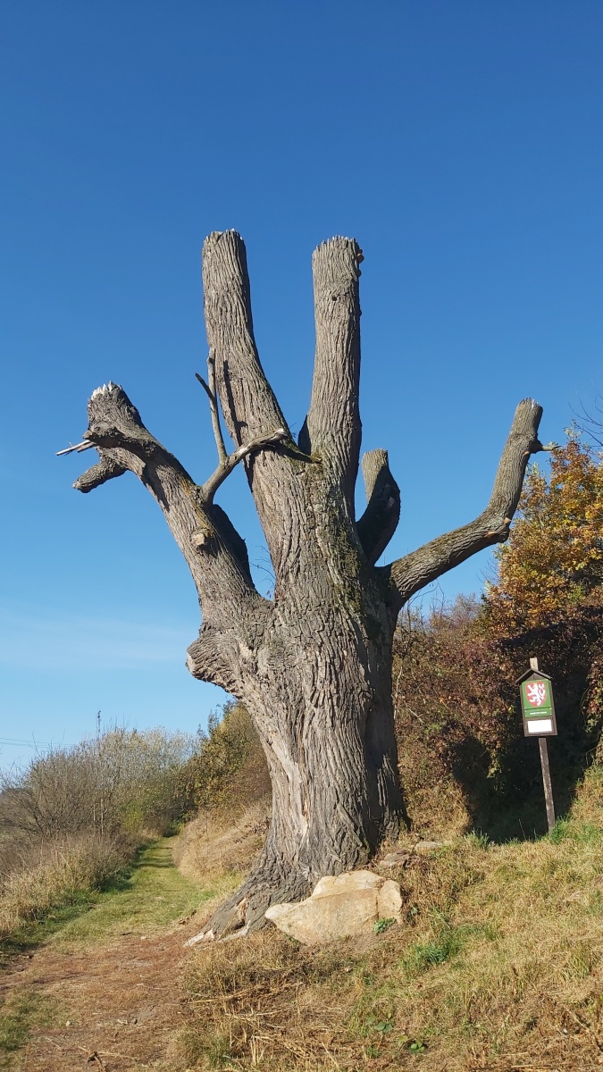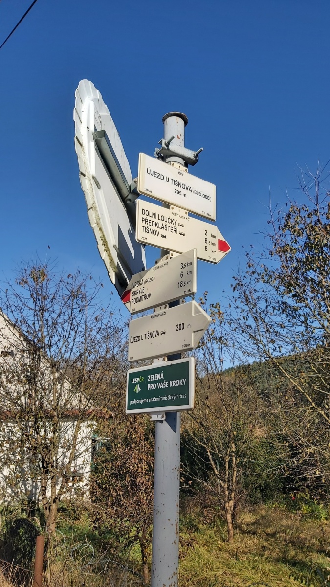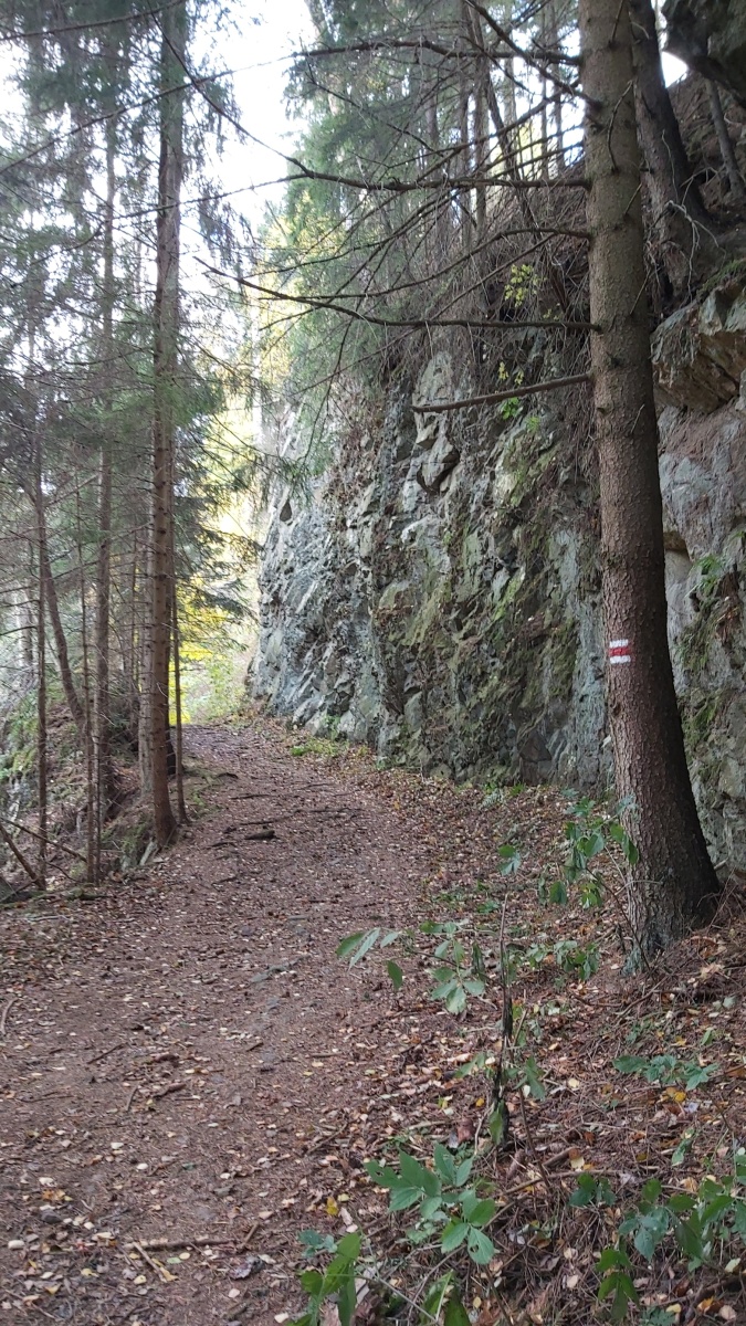 Údolí před námi se pomalu rozevírá a nám se naskytuje pohled na podzimně vybarvené svahy, modrou oblohu a to všechno kontrastující s přírodou, pokrytou jinovatkou tam, kam ještě nedosáhlo slunce. Teď už nás čeká pohodový výšlap po rovince. Slunko nám svítí do tváří, po cestě postupně shazujeme vrstvy oblečení a je nám fajn. Ještě před Újezdem už jdeme jen v tričkách a košilích/mikinách. Tahám z nosu šušeň jak hrom.