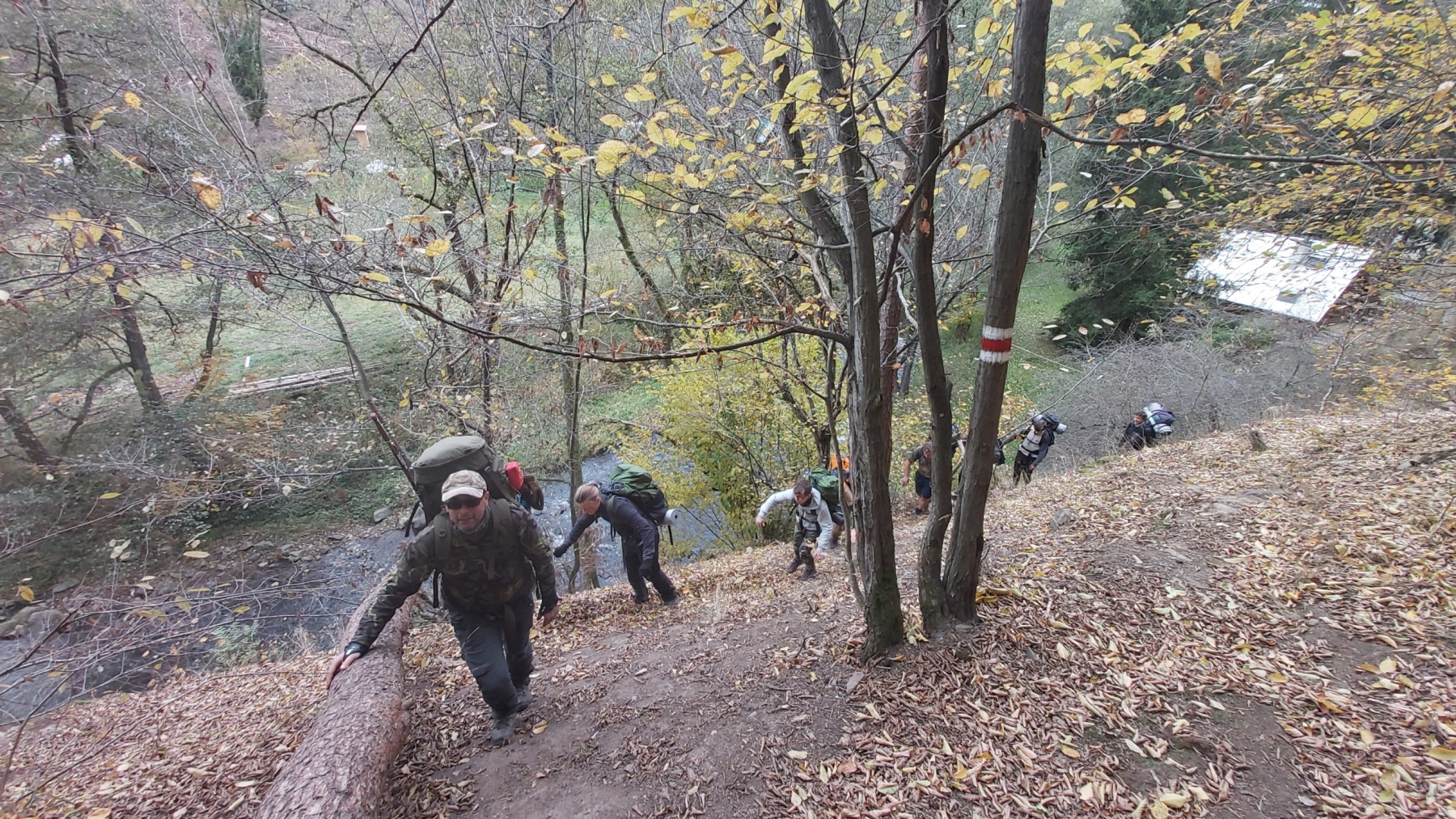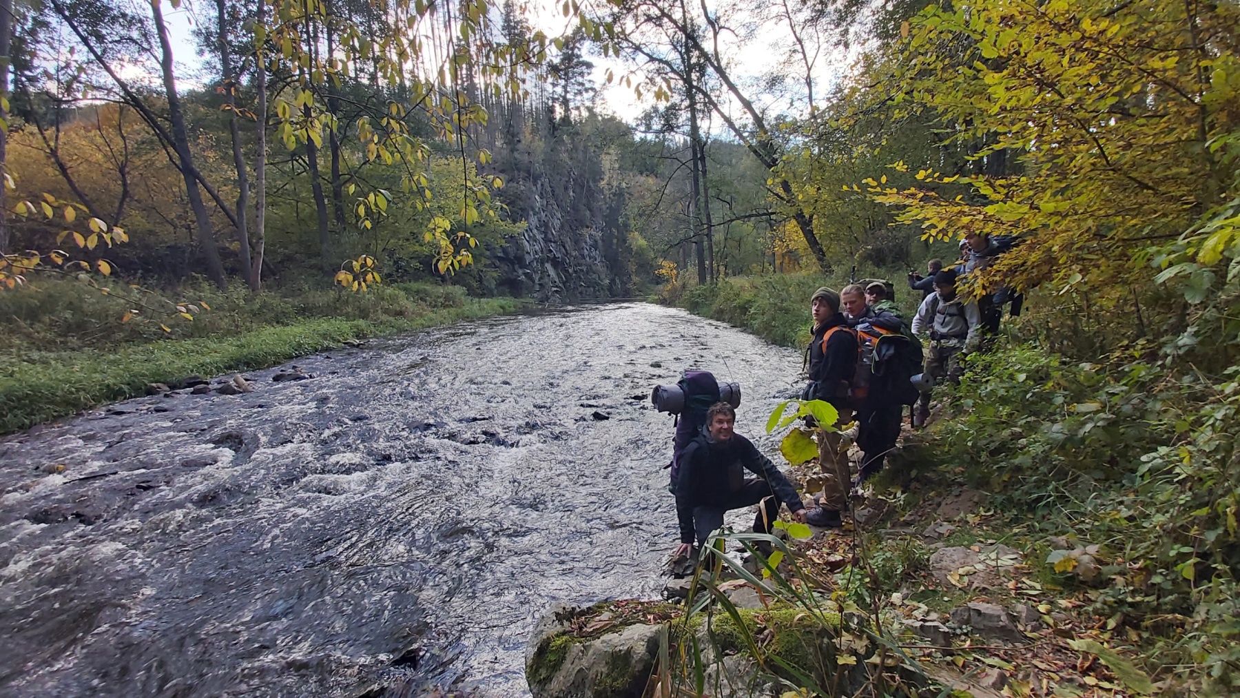 Po vydatném dlabanci vystupujeme po řetězech z rokle a pokračujeme po proudu. Po cestě se střídají parádní úseky těsně kolem vody, širokým údolíčkem, po skalách i škrábáním se po nich nahoru i dolů. Opět se zastavujeme na focení a kochání a na konci toho zážitkového úseku nás čeká odměna v podobě hospody s uzavřenou společností. Naštěstí pro nás nám to pivko a čaj dají s tím, že si sedneme venku. Po lehkém odpočinku vyrážíme najít nocoviště.