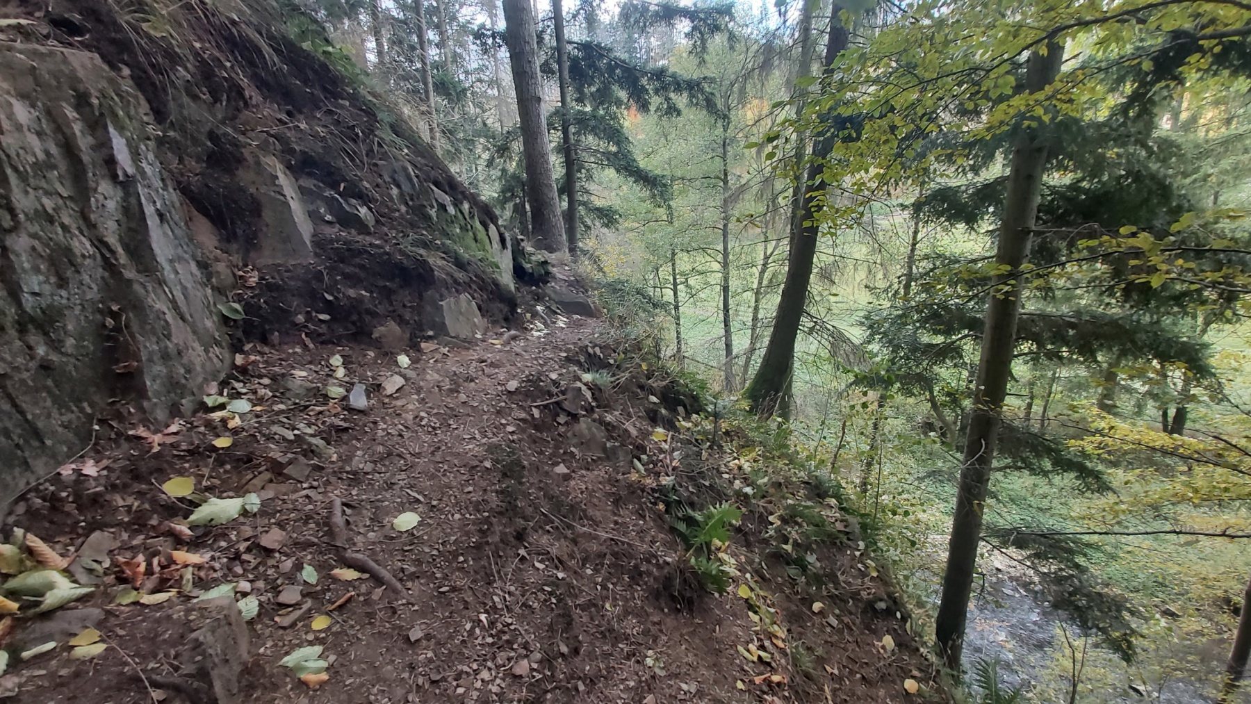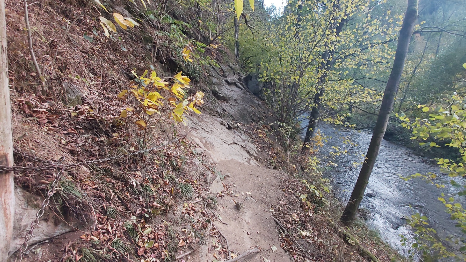 Za chatovou oblastí za Sečanem začíná dobrodružství. Stezka strmě stoupá do svahu a ve chvilce jsme několik desítek metrů nad ní. Pěšinka akorát na jednoho turistu se na levé straně zvedá strmě vzhůru a na druhé strmě padá do říčky. Po chvilce jdeme zase v podstatě na úrovni hladiny. Přicházíme do Trenckovy rokle a velíme k většímu odpočinku. Přichází hlad a tak vytahujeme vařiče a ztenčujeme zásoby jídla. Někteří z nás jdou ještě na průzkum samotné rokle. Podivujeme se nad chatičkou, ke které je dost náročný přístup a nad tím, jak tam asi všechen ten materiál na stavbu dopravovali. Odfotím ještě vodopád samotný a pak už zpět ke skupině.