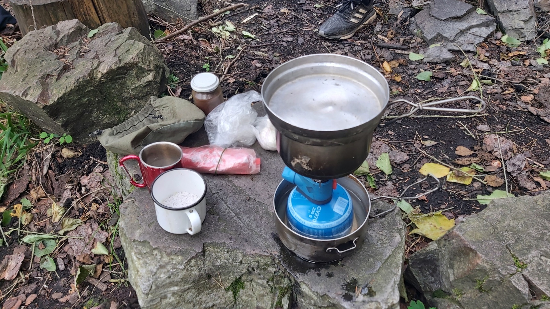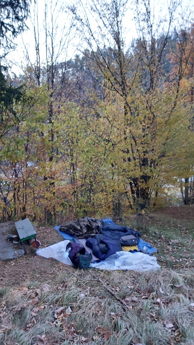 Ráno nás vítá modrou oblohou posetou kýčovitými mráčky a slibuje barevný podzimní den jako z pohádky. Snídani a ranní kávu a čaj by byl hřích dělat na vařiči, takže oheň je za chvilku rozdělaný a pálíme dřevo, co zbylo z noci. Hofeci tentokrát vzali i 16 vajec, takže vajíčka, míchaná v rendlíku takhle po ránu byl luxus, těžko srovnatelný jen tak s něčím. Jak to tak bývá, když je ráno oheň, těžko se odchází. Nikam nijak extra nespěcháme a podle motta „Kilometry radost neměří“ si děláme ještě jednu várku čaje a kávy.
