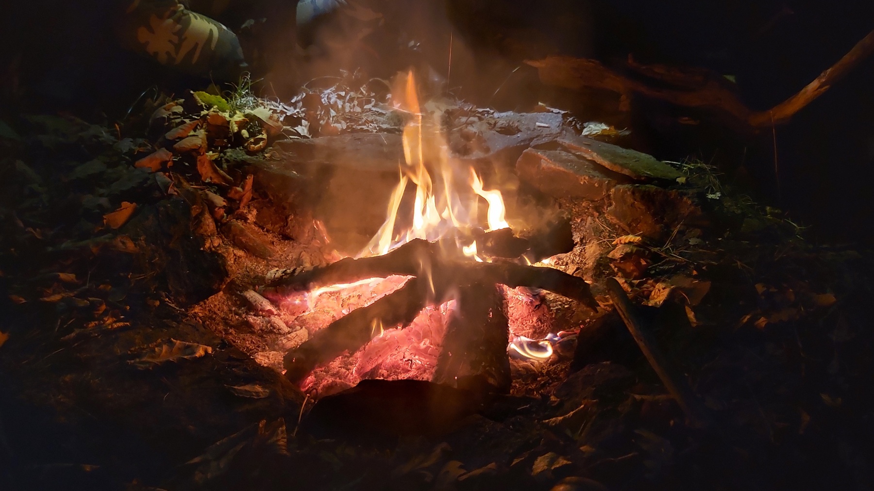 Mě to nedá a, už za tmy, dělám průzkum. Po prodírání se 200 metrů křovím nacházím opuštěnou zazimovanou chatičku a OHNIŠTĚ! Vracím se zpátky a dělím se o svůj nález s návrhem na taktický přesun. Přemlouvat nikoho nemusím. Během chvilky už sbíráme dřevo cestou na naše budoucí nocoviště. Plácků na lehnutí je tak akorát a za chvilku už praskají větvičky a plameny polykají nasbírané palivo. Obrátka o stoosmdesát, jak z filmu.