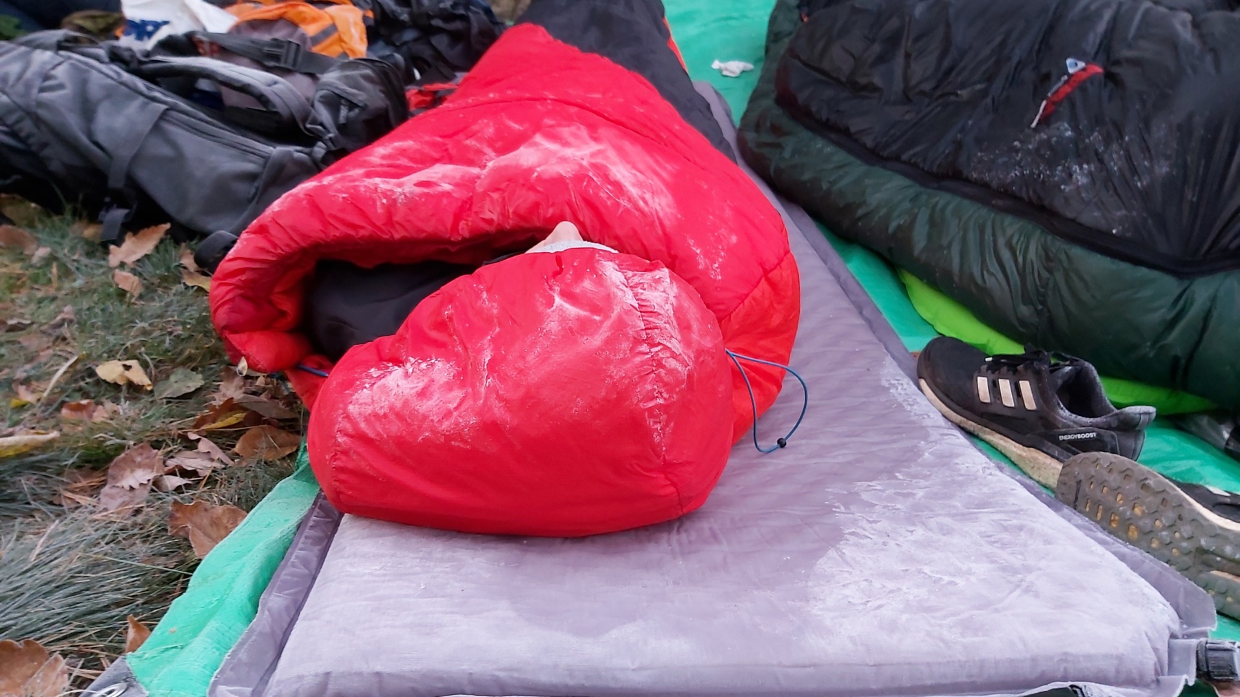 Ráno nás probouzí azurem, bezvětřím a mrazíkem. Všude kolem nás, včetně nás, je vše pod jinovatkou. Někteří se vyspali líp, někteří hůř, ale přežili jsme všichni. Do takového rána se ze zpacáku vylézá těžko, ale borci se ujali rozdělat oheň, tak to nakonec přece jenom šlo. Při balení vyklepáváme jinovatku, kosa už je vyklepaná dostatečně. Není moc proč zahálet, takže se balíme a vyrážíme dál.