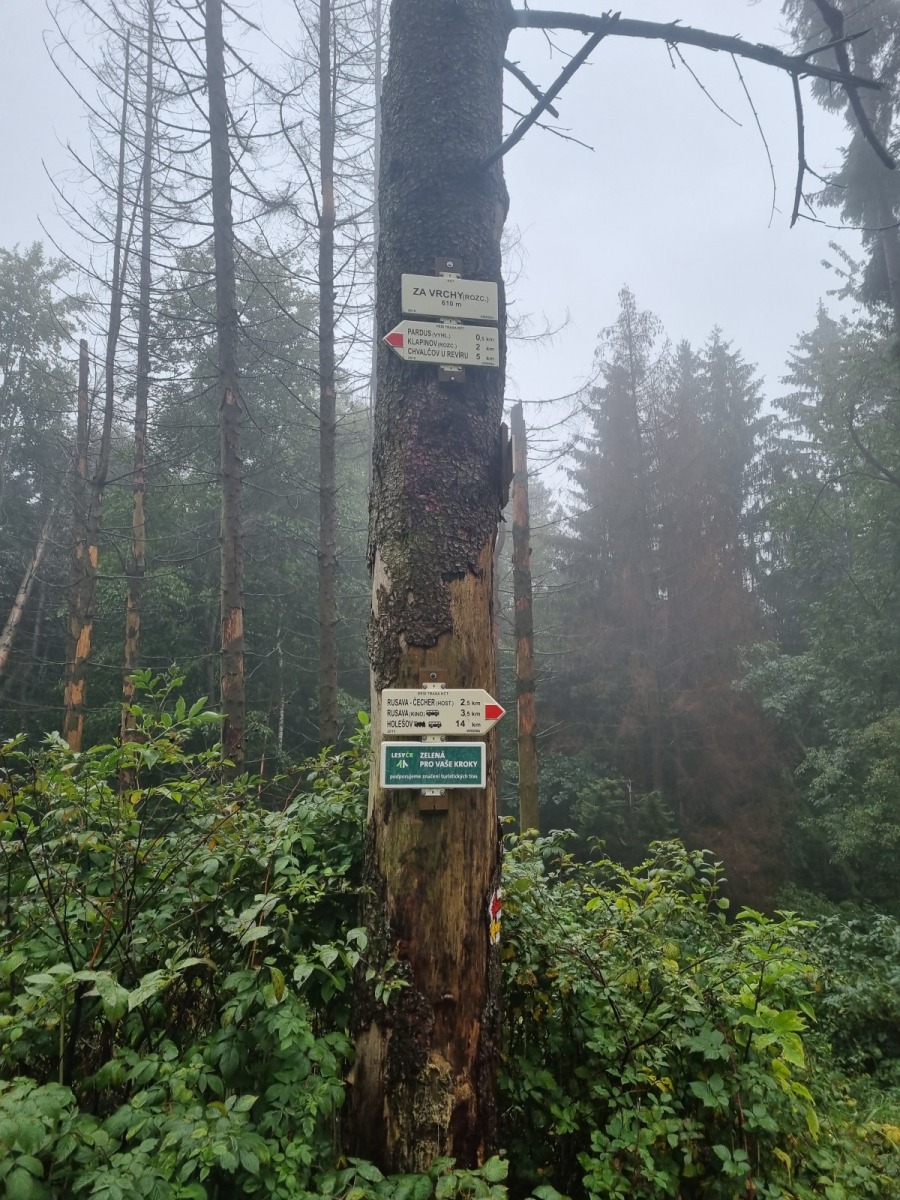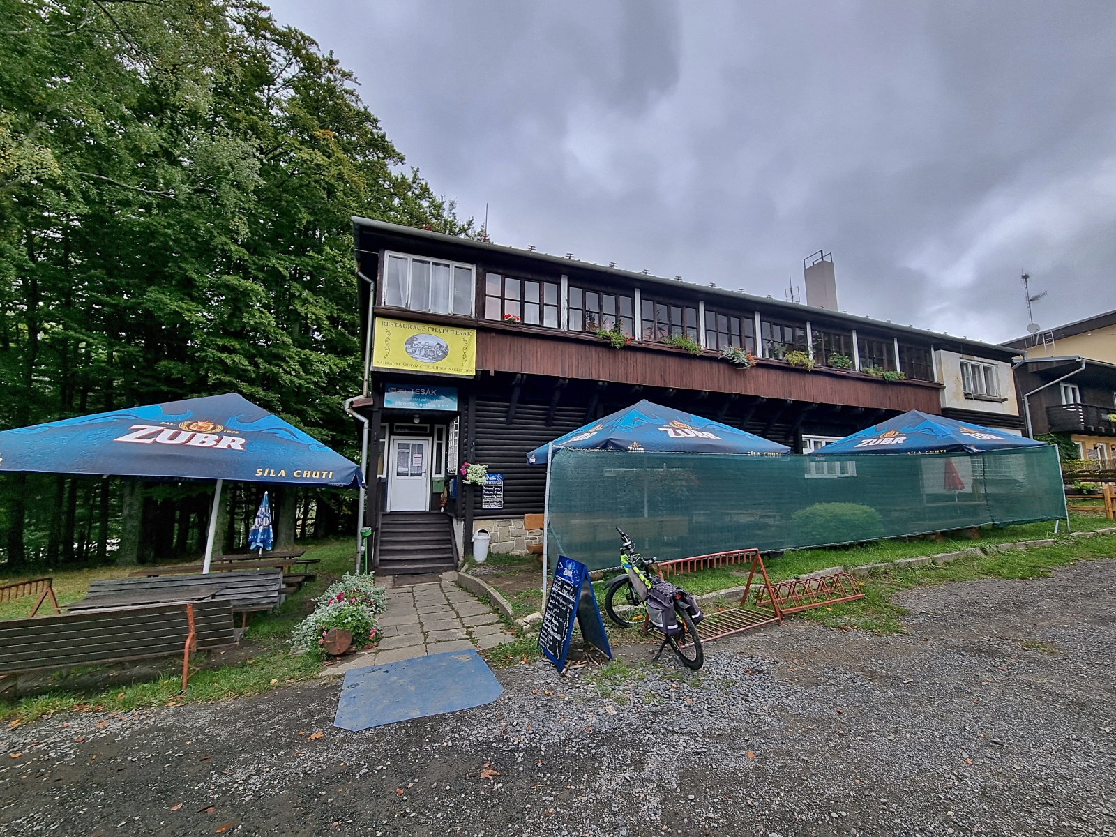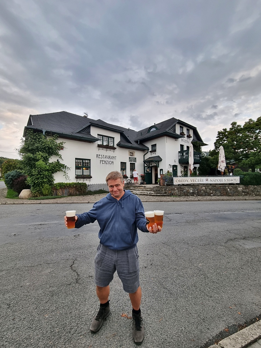 Nasazujeme batohy a čeká nás 6 kiláků na Rusavu. Počasí je akorát a tak šlapeme po nepohodlné silnici. V Brusném zastavujeme a zjišťuju, že za 11 minut nám jede bus, který nám zkrátí zbylé nepohodlné asfaltové kiláky. Radim toho využívá a briskně donáší tři kelímky piva. Vtipkujeme s milou cyklistkou, která se jela uklidint na pivo a po chvilce už exujeme kelímky, protože bus je tu. Do Rusavy přijíždíme o půl sedmé a jsme za to rádi. Rozbalíme bivak ještě za světla a pak hurá do hospody. Zabydlujeme se na terase chatky a připravujeme si proslov pro případné uvědomnělé sousedy. Po převlečení do suchého mažeme do Zelené hospody.