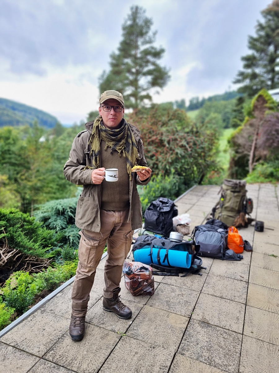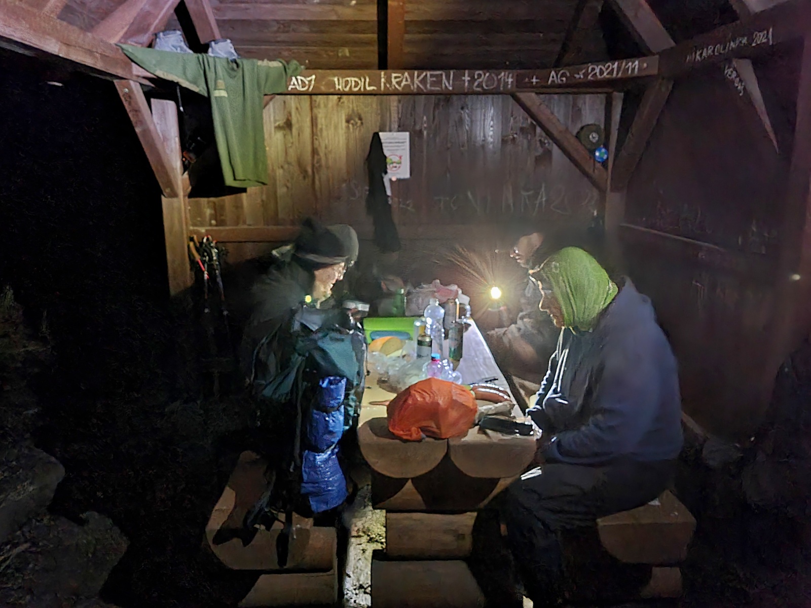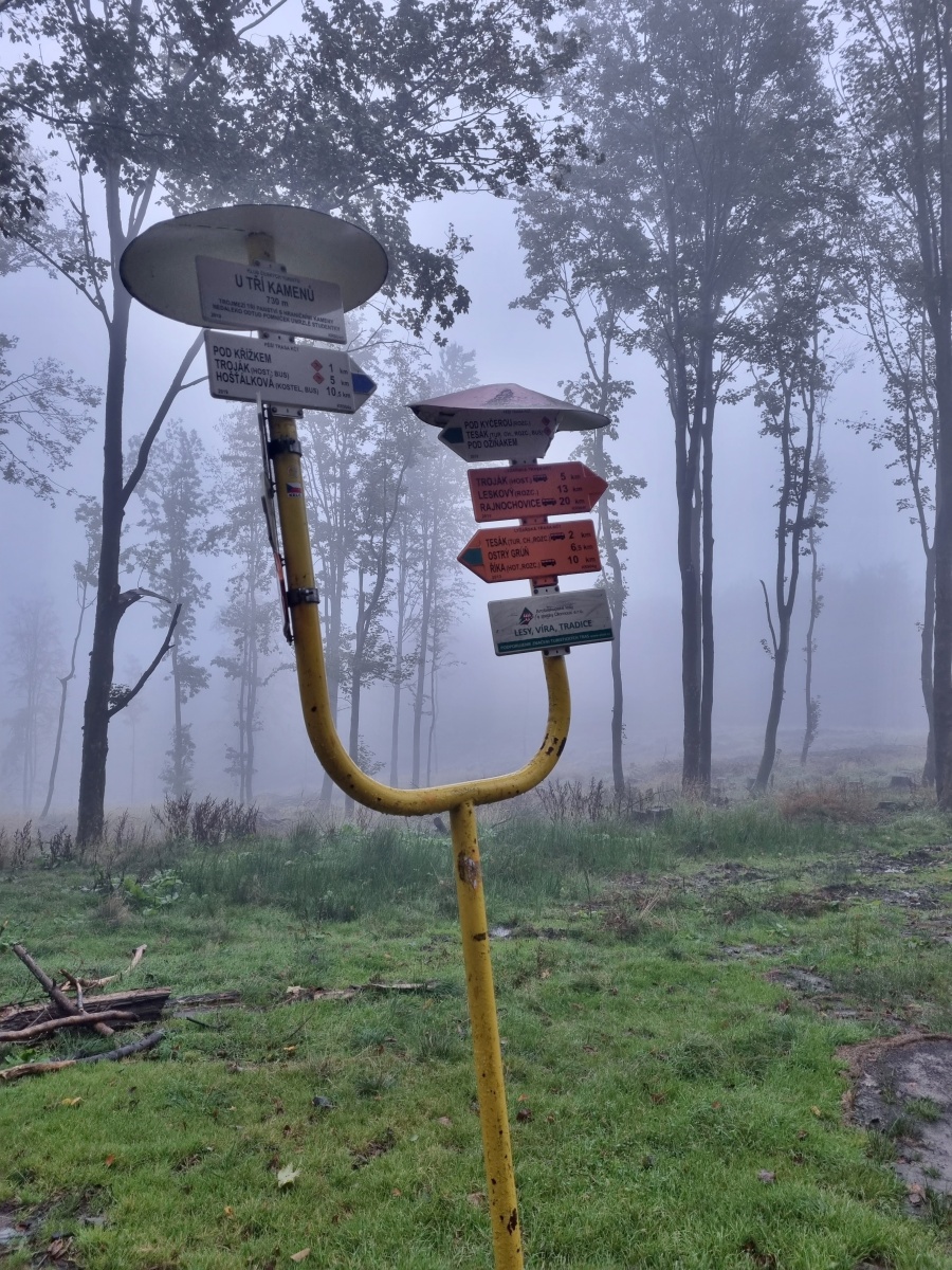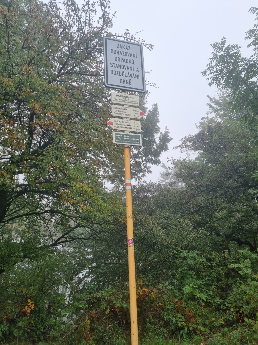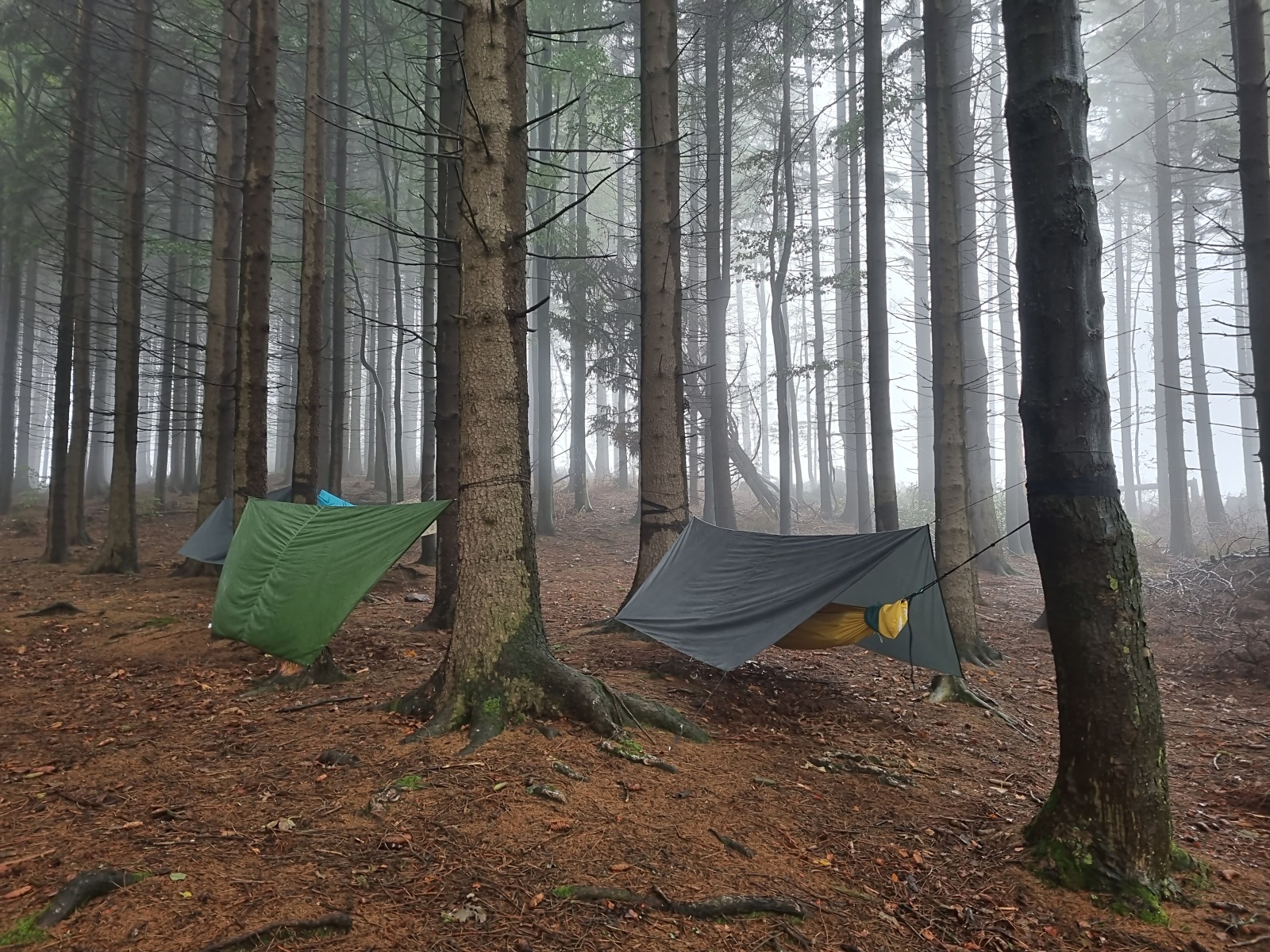 V noci se párkrát budím práskaním plachet, ale ihned spokojeně usínám.  Nedělní ráno je typické podzimní sychravo. Vůbec se nechce vylézat ze spacáku. Oťas hlásí, že v 0710 přestane pršet a taky že jo. To už se ale vaří voda na kávu a čaj a snídá se. Balíme věci, abychom byli připravení na další kapky se zabalenými batohy. Kolem osmé vyrážíme, není nač čekat. Postupně sestupujeme dolů a sledujeme jak se okolní lesy a hřebeny částečně schovávají do mlhy. Cestou potkáváme potenciální krásná vyhlídková místa, která jsou teď ovšem přepnutá do módu defaultní šedi. Chytá nás deštík, který sice není silný, ale v kombinaci s větrem je trošku míň pohodlný.
