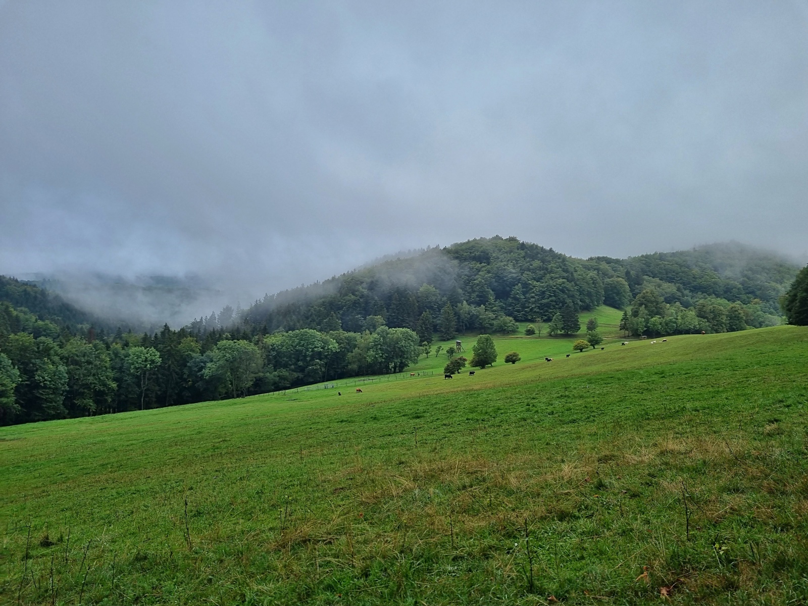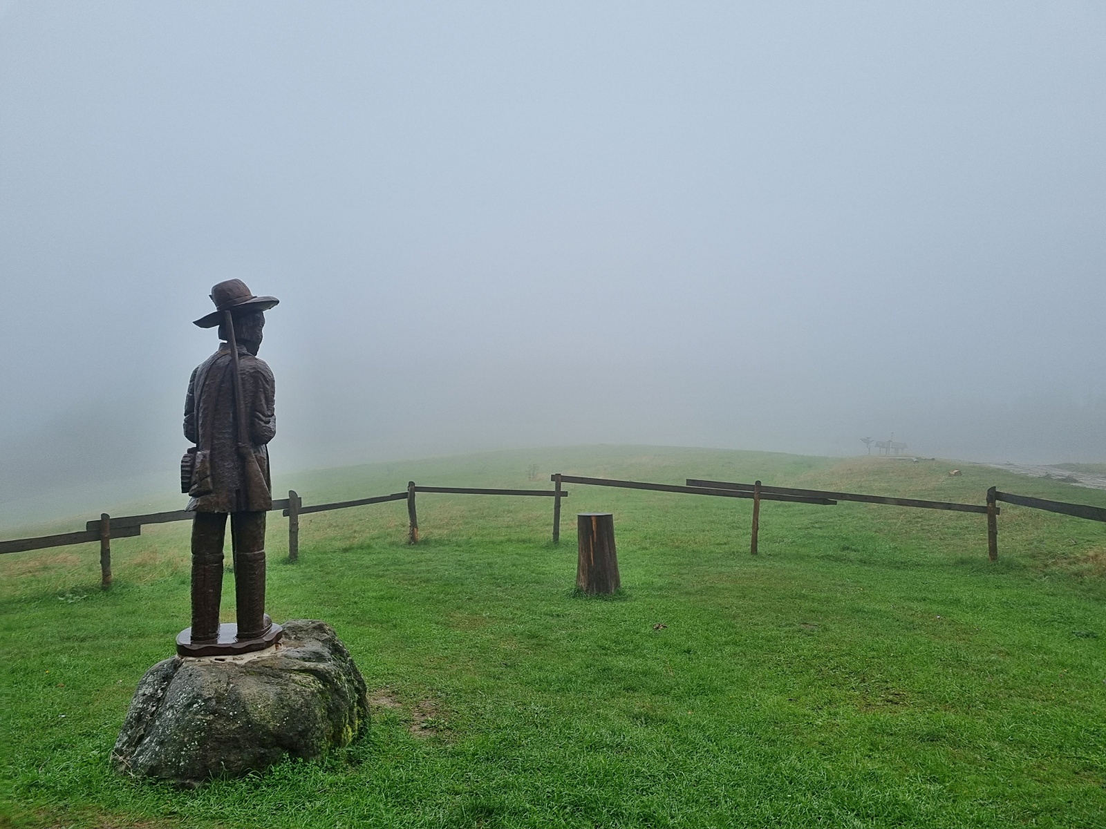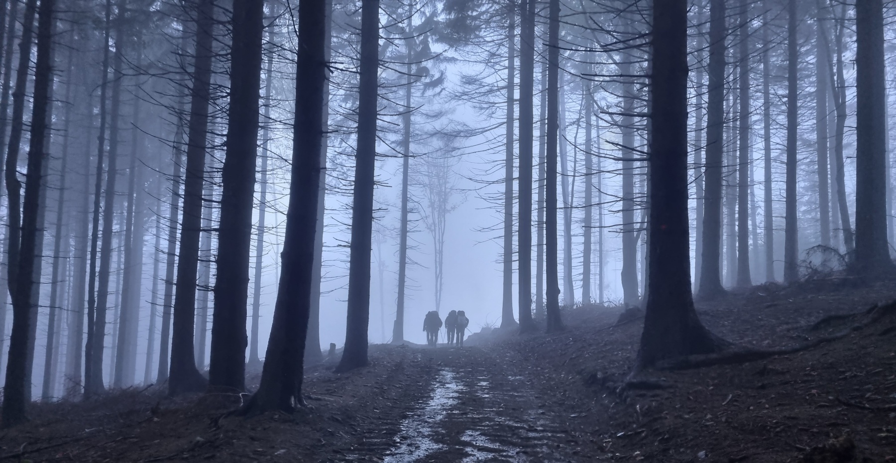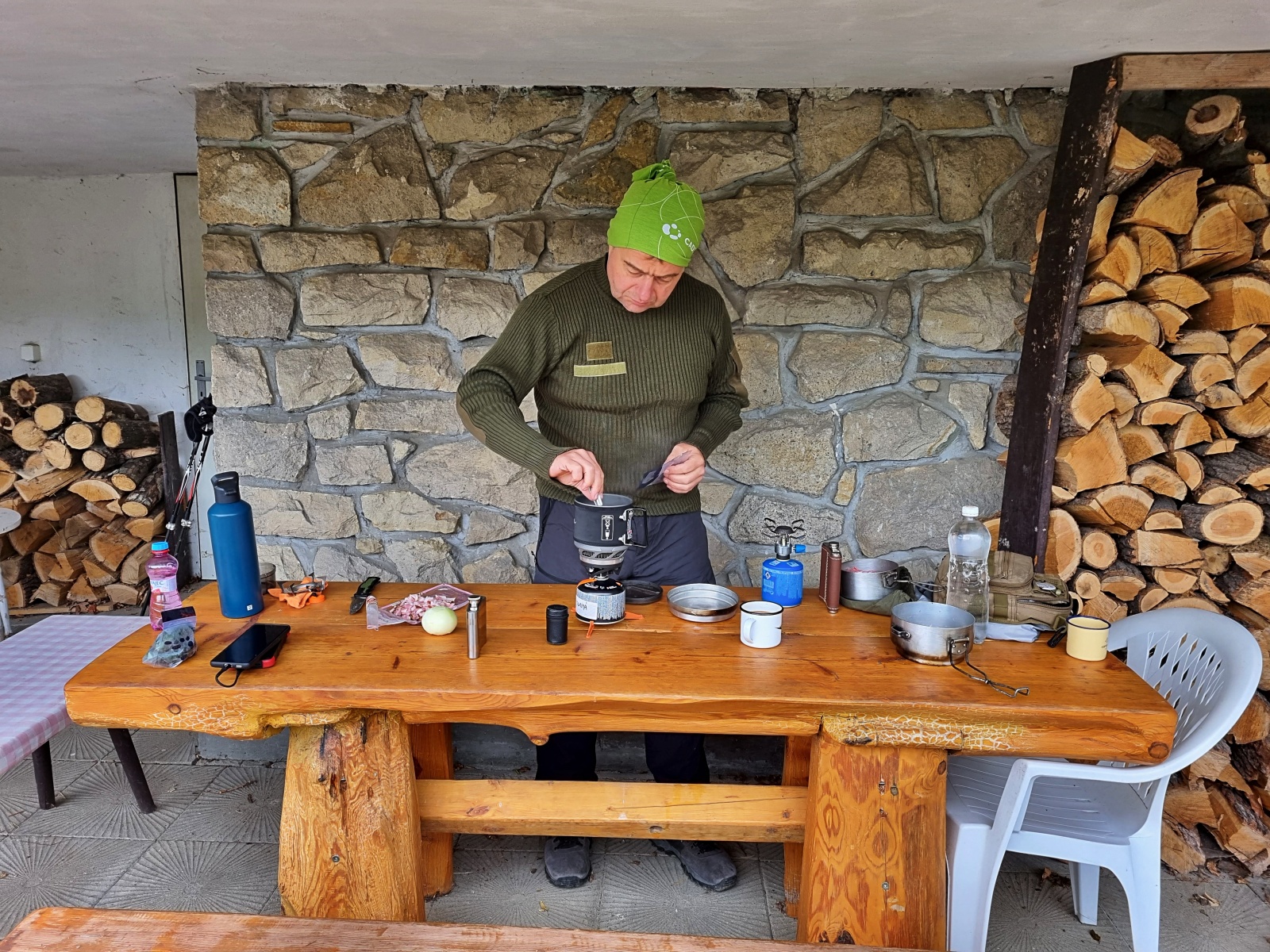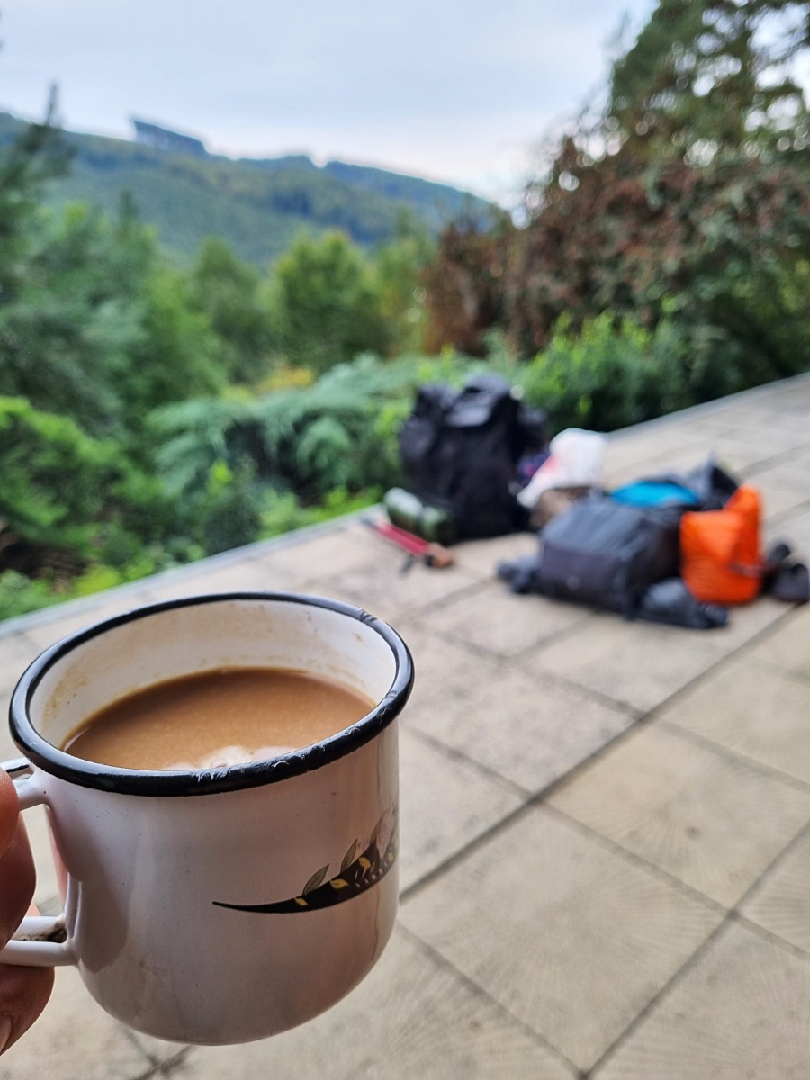 V noci se párkrát budím práskaním plachet, ale ihned spokojeně usínám.  Nedělní ráno je typické podzimní sychravo. Vůbec se nechce vylézat ze spacáku. Oťas hlásí, že v 0710 přestane pršet a taky že jo. To už se ale vaří voda na kávu a čaj a snídá se. Balíme věci, abychom byli připravení na další kapky se zabalenými batohy. Kolem osmé vyrážíme, není nač čekat. Postupně sestupujeme dolů a sledujeme jak se okolní lesy a hřebeny částečně schovávají do mlhy. Cestou potkáváme potenciální krásná vyhlídková místa, která jsou teď ovšem přepnutá do módu defaultní šedi. Chytá nás deštík, který sice není silný, ale v kombinaci s větrem je trošku míň pohodlný.