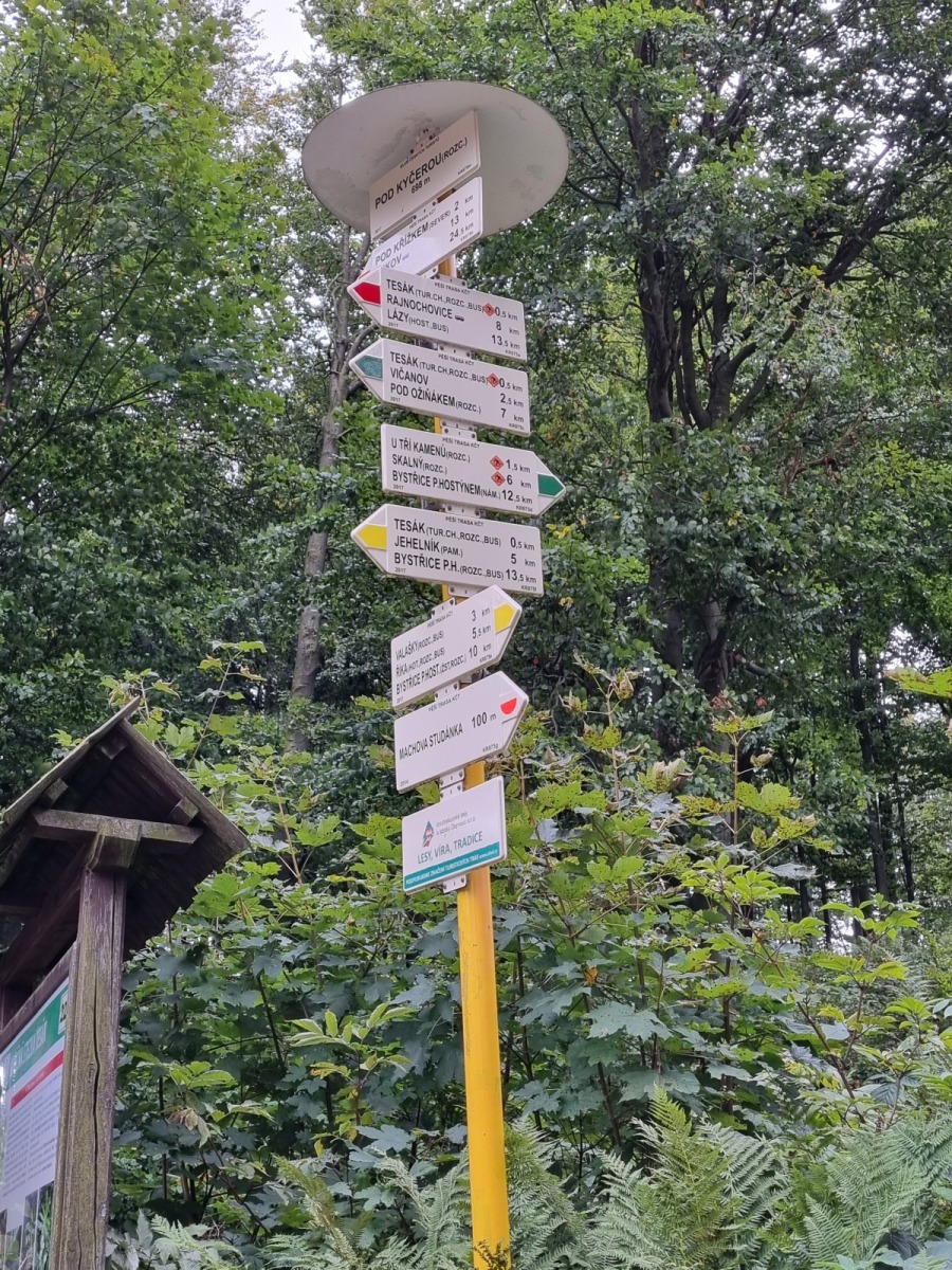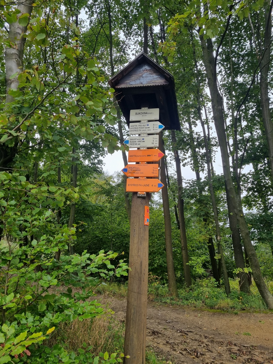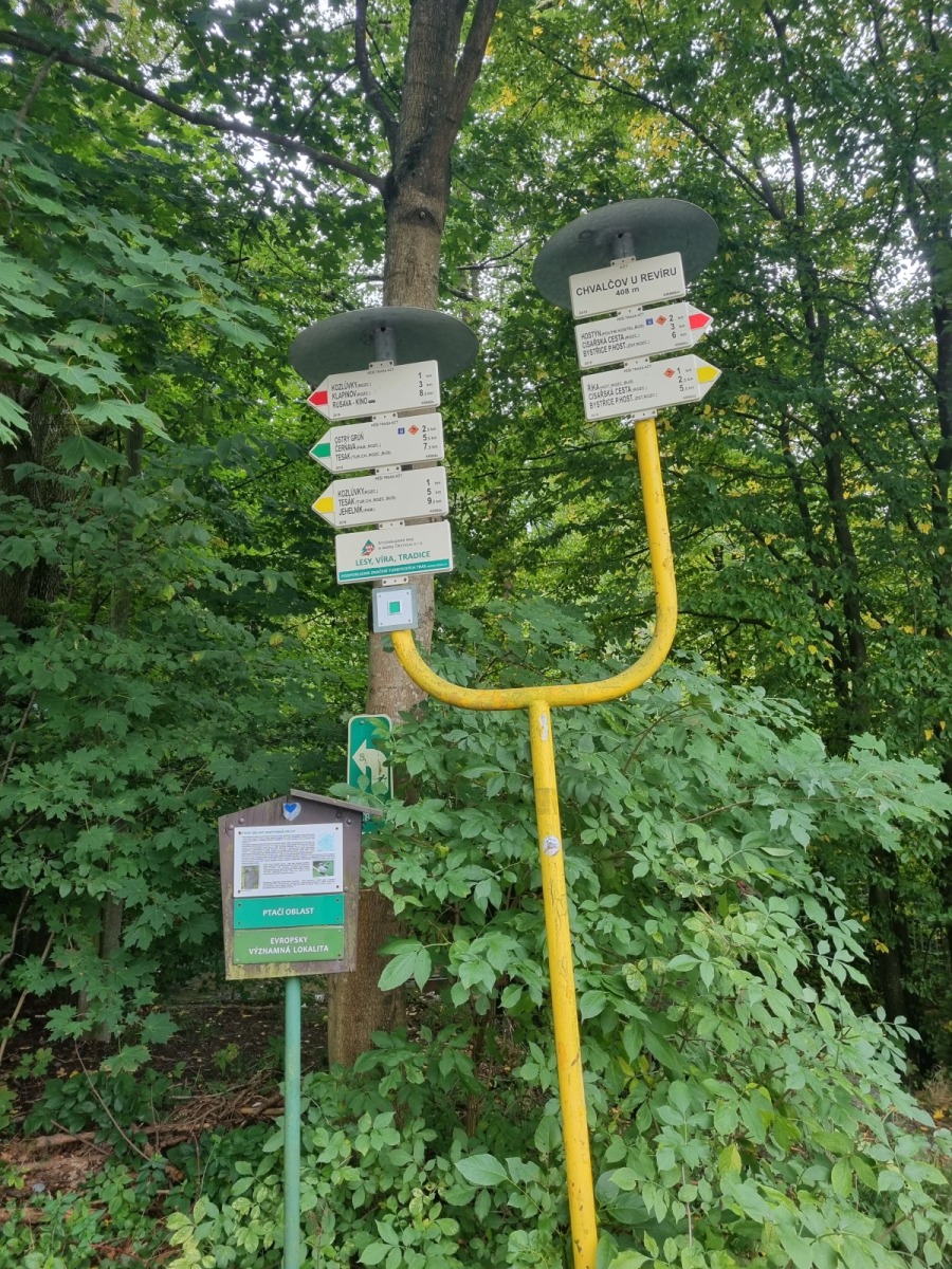 Pokračujeme od Hostýna sešupem dolů a na přístřešku u Chvalčova dáváme pauzu na větší dlabanec. Odtud už nás čeká jenom nekonečné stoupání směrem k Tesáku, tak ať nabereme síly. Moudře hovoříme o muzice a psaní a o spoustě dalších věcech. Po jídle se pomale pakujeme a jdeme na to. Necelý kilometr rovinka a pak už by se žlutá měla zvedat nad říčkou. Nicméně místní nás informují, že trasa je přeznačkovaná kvůli težbě a my jsme za to rádi, protože mapy.cz tuhle změnu zatím neevidují. Musím ji nahlásit a jsem rád, že mám zapnutý tracker.
