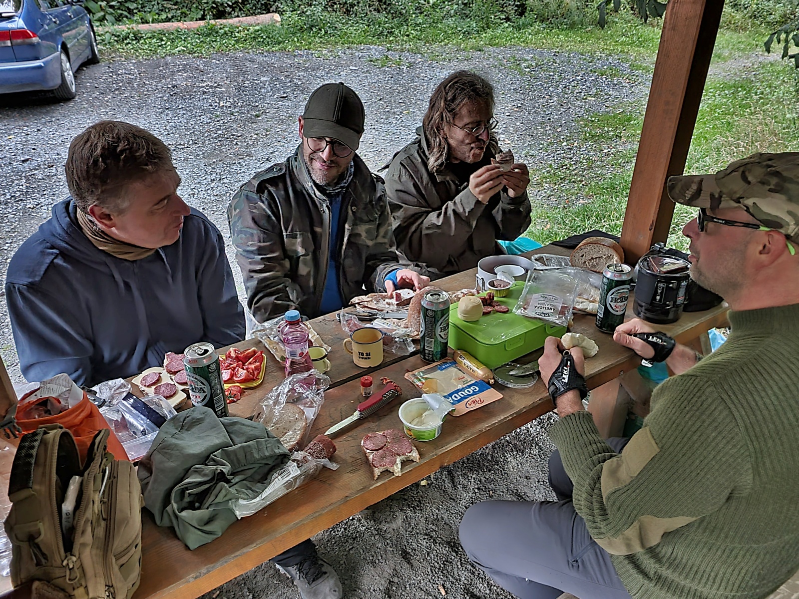 K té přicházíme 25 minut před otvíračkou a tak počkáme, protože vidina polévky a piva, přinesené milučkou zrzkou je silná.  V hospodě je líp jak na světě a my jsme spokojení a pomale se smiřujeme s tvrdou realitou nedělního návratu. Platíme a sedáme v pěti do auta. Poprchává a je to takové příhodné. Po chvilce jsme na dálnici a já usínám, přičemž se budím až v Rousínově. To už je dlouho, co jsem v autě usnul naposledy. S chlapama se loučíme a všichni si vzájemně děkujeme za parádní vandr a sdílení sounáležitosti. Tak snad ještě letos při prvním mrazíku. A když ne, tak na jaře.