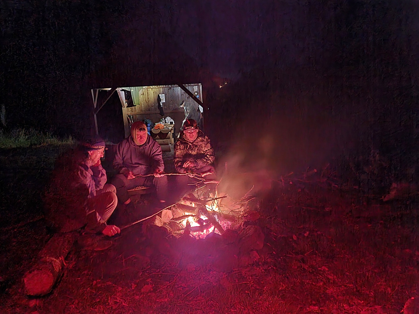 Před šestou odcházíme, čekají nás ještě necelé dva kiláky ke třem kamenům. Tam docházíme v pohodě za světla, stavíme přístřešky s hamakami a David se bleskurychle ujímá rozdělání ohně. Konstantně fouká, takže oheň blafne a hoří rychle, nicméně u něj moc teplo není. Večeříme, popíjíme, hlaholíme a kolem pů desáte to postupně balíme, protože začíná pršet. Zůstávám u ohně jako poslední a než odcházím i já, rozhrnju jej. S hašením si dělat starosti nemusím, déšť se stará a za chvilku už slyčím jen syčení. Fouká vydatně, ale bez nárazů, takže veškeré přístřešky snad vydrží.